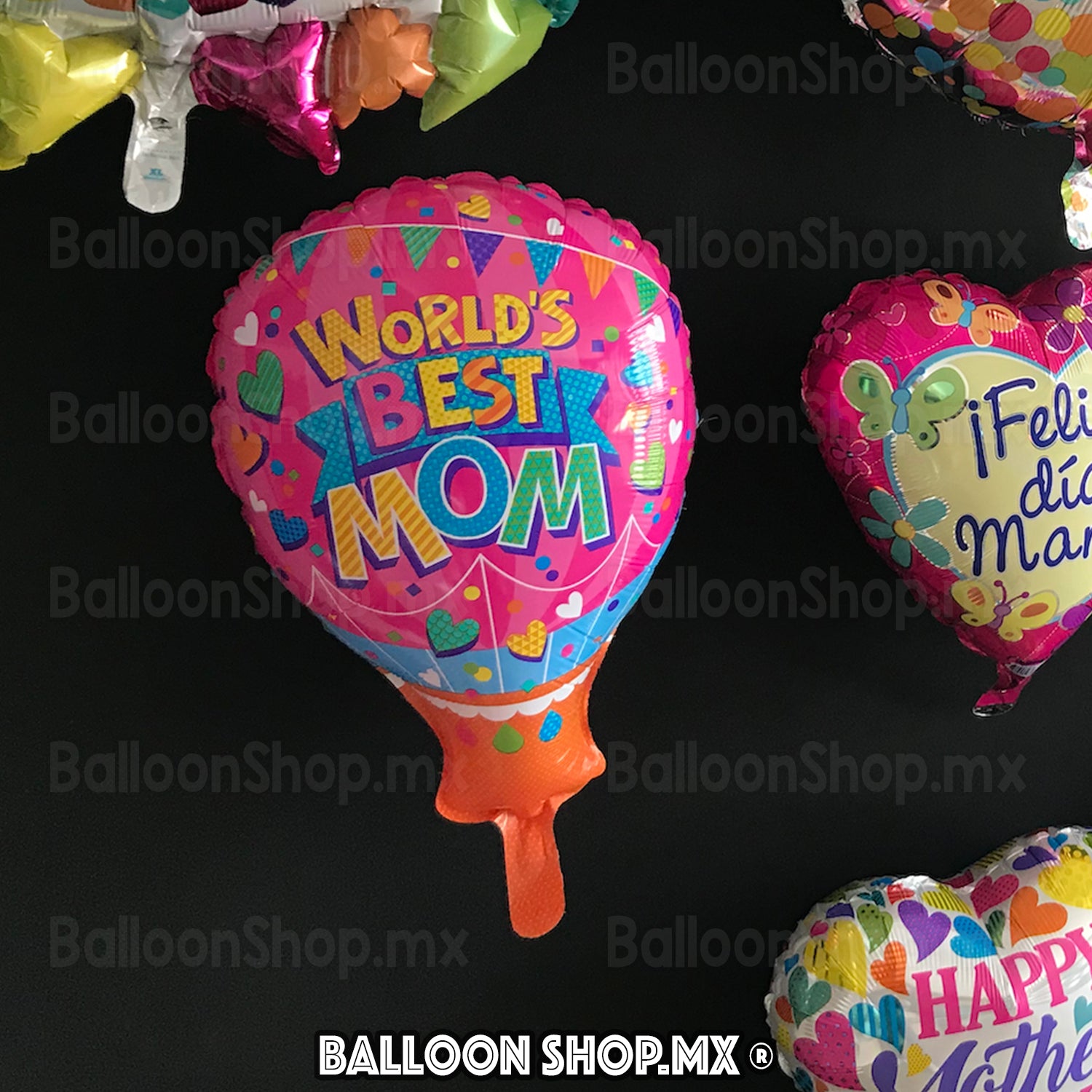 Globo aerostático en color rosa brillante con la frase " World's Best Mom" al centro en colores brillantes. El resto del globo viene decorado con unos banderines, corazones y confeti; en cada uno de estos ademas del color brillante viene con un patron de diseño como lineas, bolitas, polka, etc. ste modelo puede ser usado para un cumpleaños, el día de las Madres, una fecha especial o como un detalle.