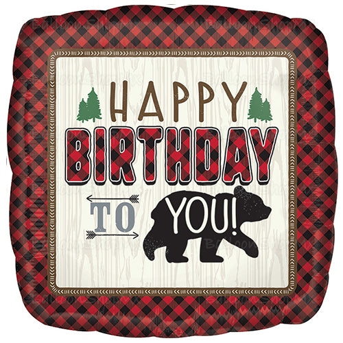 Globo en forma cuadrada decorado con un patrón textil de cuadros rojos y negros, al centro enmarcado en lo que simula ser madera la frase "Happy Birthday to you" con un oso negro, unos pinos y unas flechas.