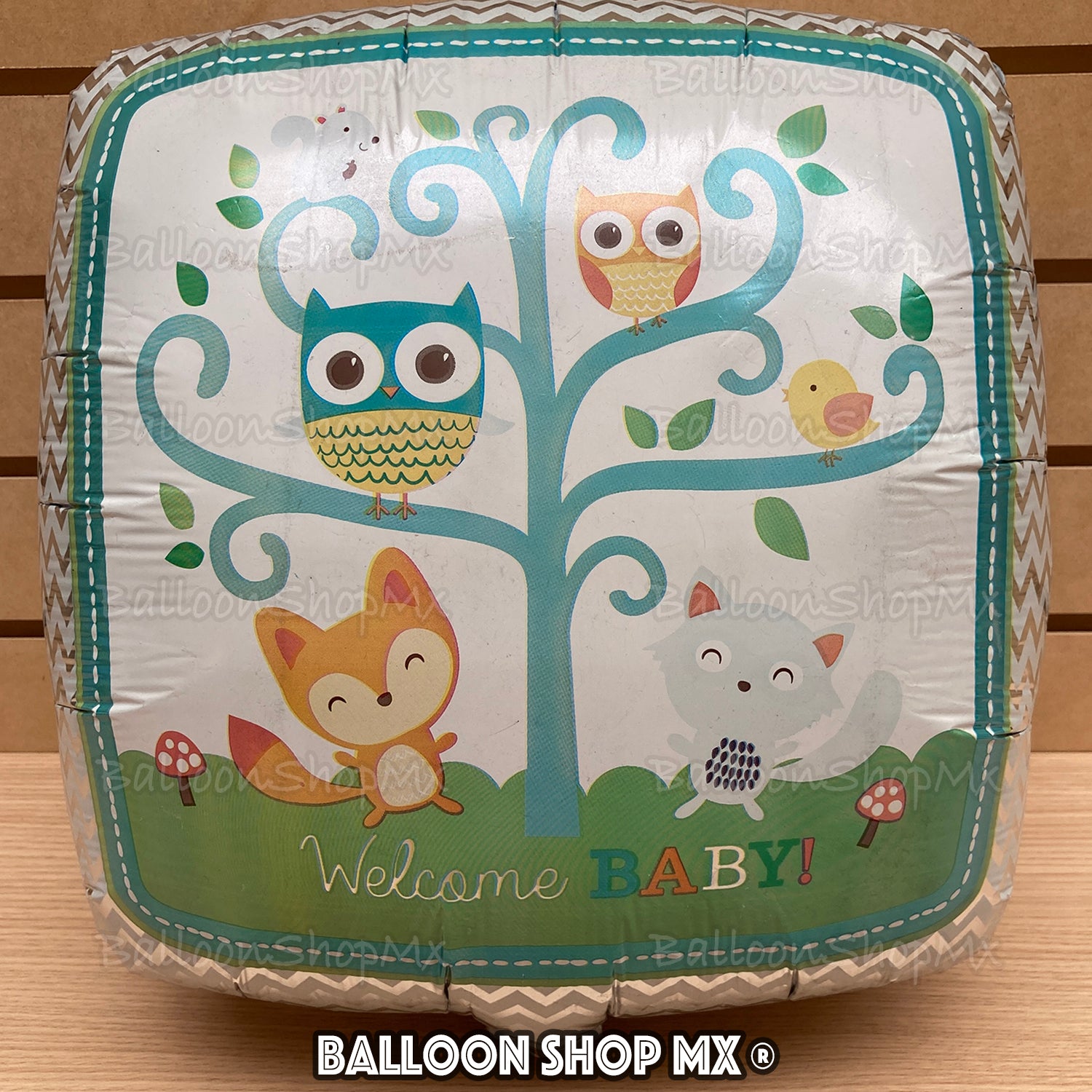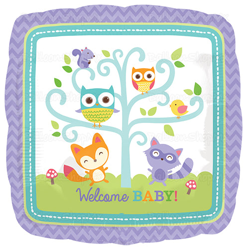 Globo de 18" cuadrado decorado por un patron chevron en tonos morados en el exterior y al centro una imagen de un árbol con animalitos del bosque como un zorrito, mapache, buchones, pajaritos y una ardilla. En la parte inferior la frase "Welcome Baby".