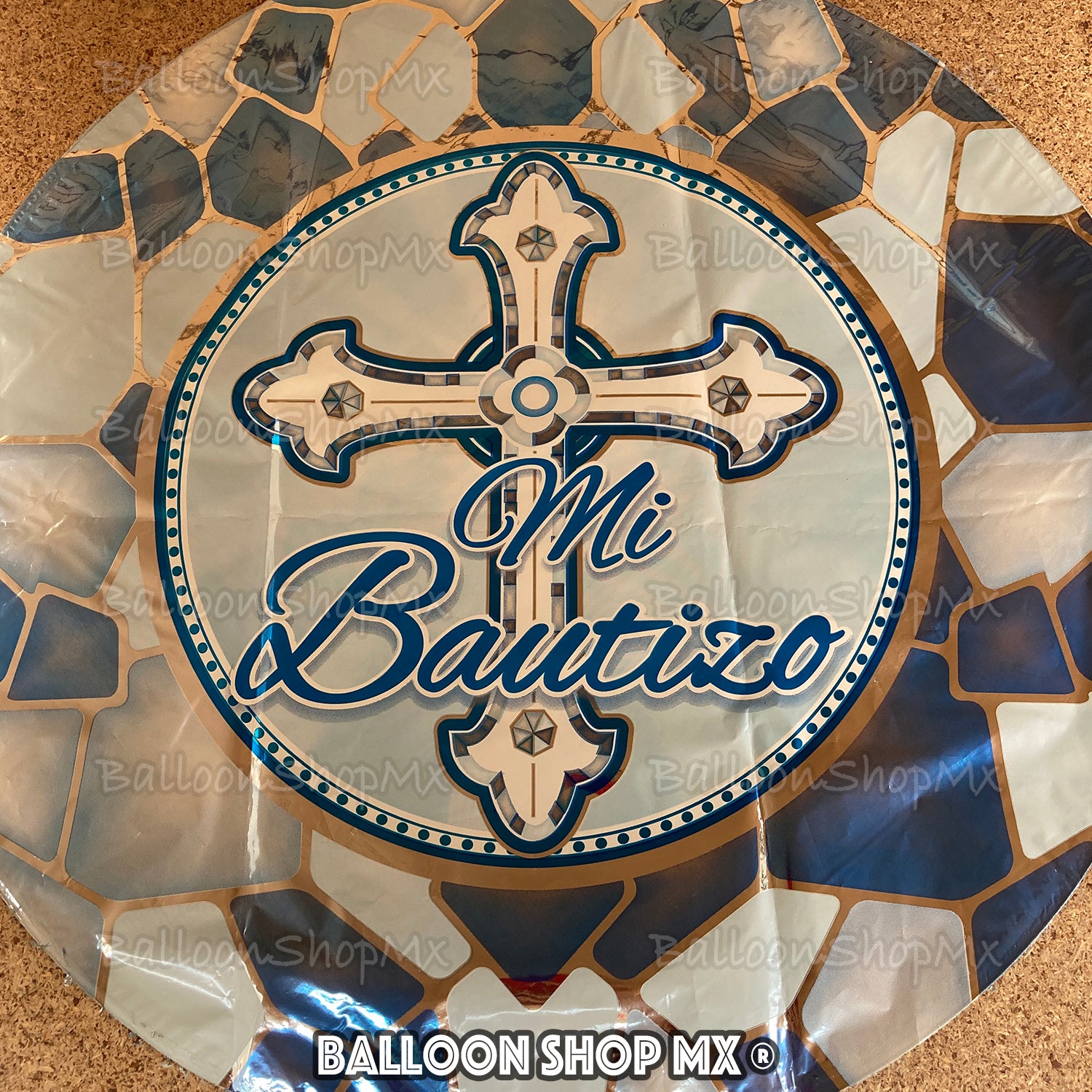 Globo redondo combinado en color azul pastel y azul metálico, decorado al centro con una cruz y la frase "Mi Bautizo", el resto del globo viene decorado con un patrón de diseño tipo vitral con un color dorado metálico que acentúan esos detalles.