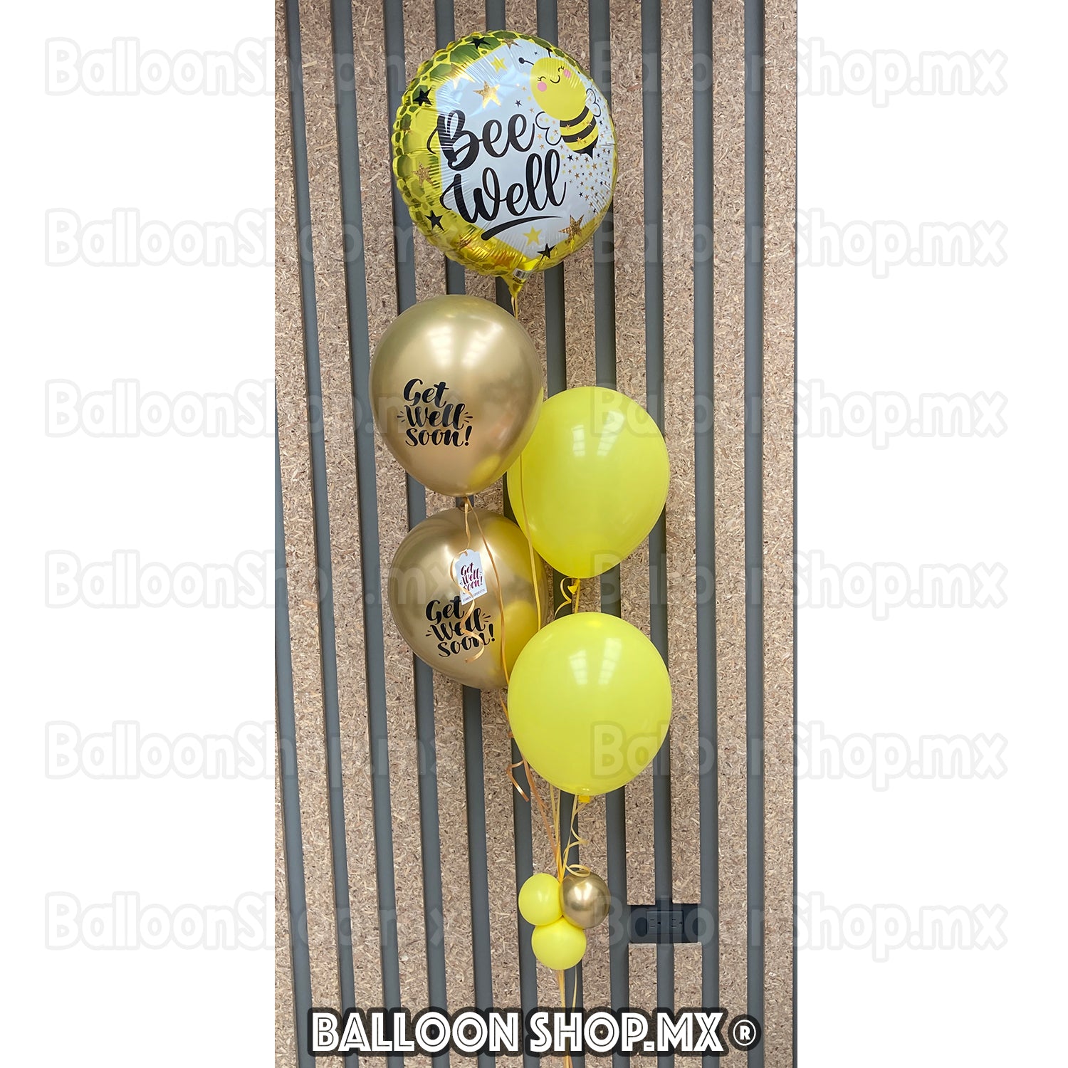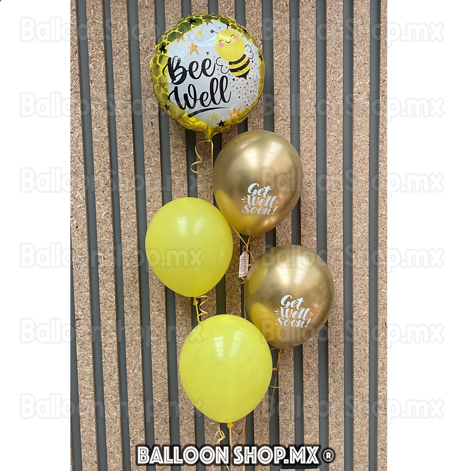 Globo redondo en color amarillo decorado con panales y estrellas en color dorado metálico, al centro en un hexágono blanco la frase "Bee Well" y una abejita volando.