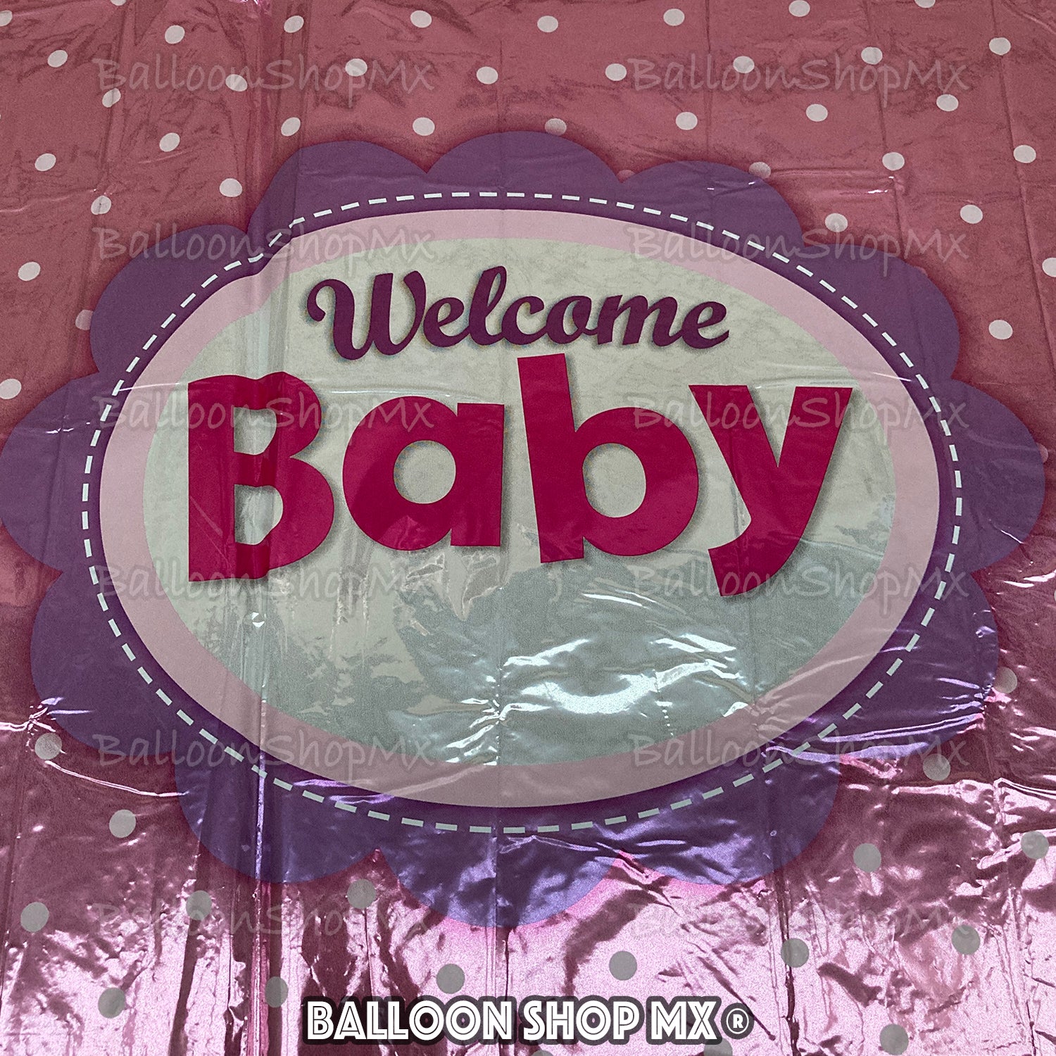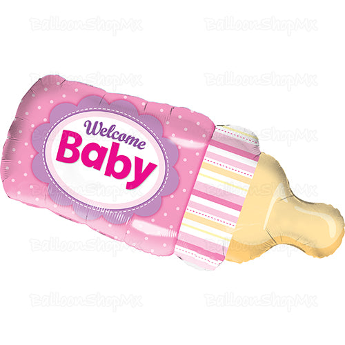 Globo con forma de biberón color rosa con detalles amarillos y morados, al centro la frase "Welcome Baby" y un espacio donde podemos colocar el nombre del bebé con vinil.