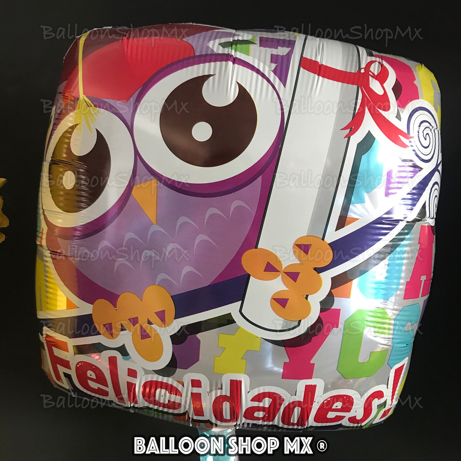 Globo cuadrado de 18" con un búho sosteniendo un diploma / título en una ramita con la frase "Felicidades", al fondo hay un collage de letras.