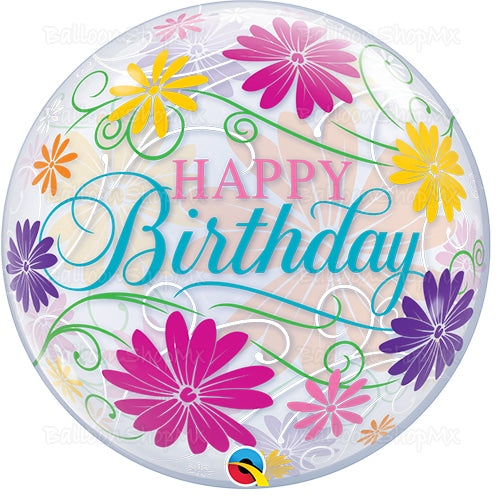 Globo burbuja transparente con diseño floreado en colores pastel y en una cara la frase "Happy Birthday", al reverso viene decorado con flores grandes.