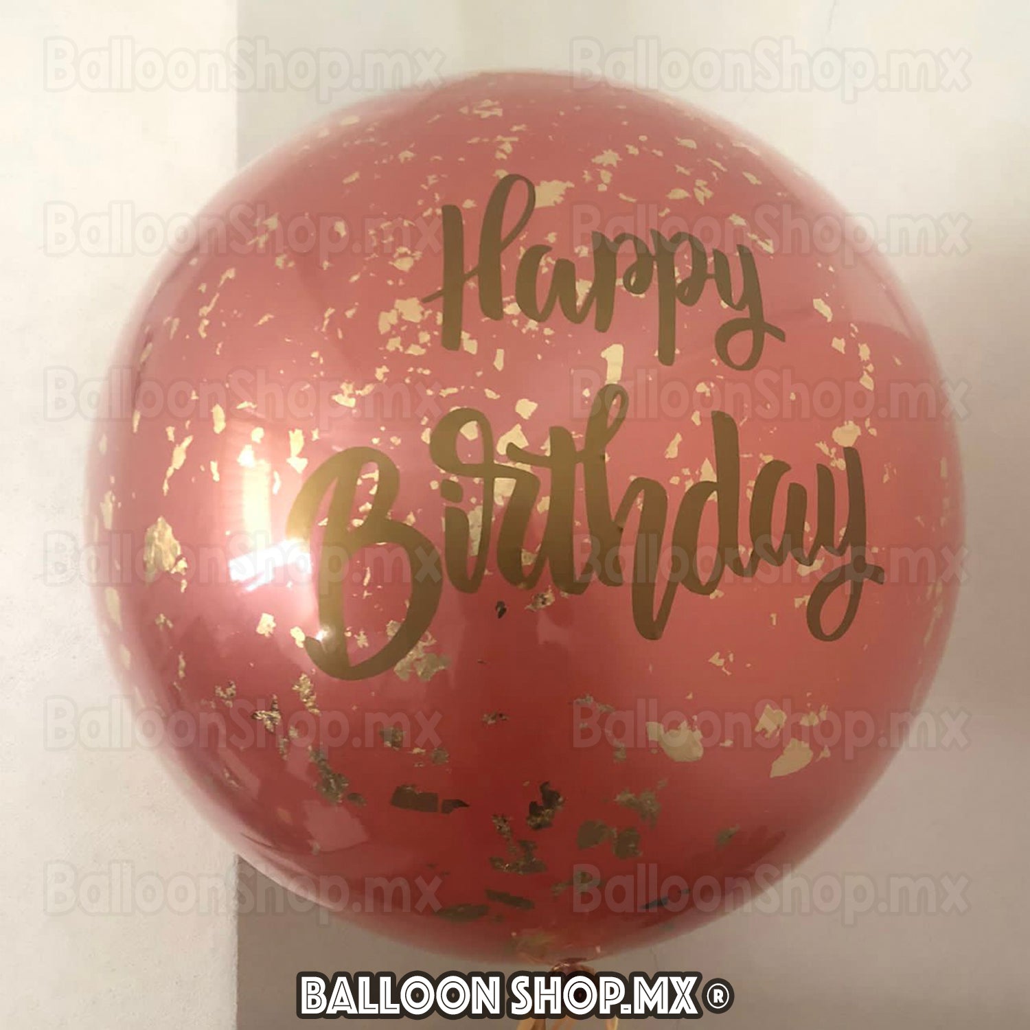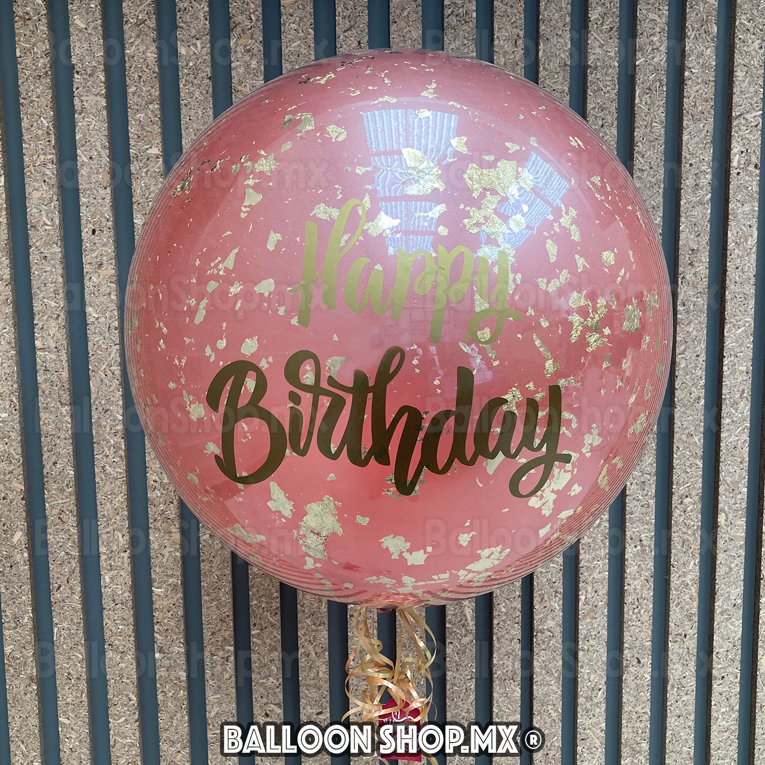 Globo decorado con virutas de hoja de oro en diferentes tamaños y terminado en un acabado brillante. Contamos con varios colores de globo disponibles (blanco, negro, oro rojo, oro rosa, arena, beige, eucalipto, tonos pasteles, etc), un asesor con gusto le proporcionara los tonos y combinaciones disponibles de globo y el diseño de vinil para el personalizado.