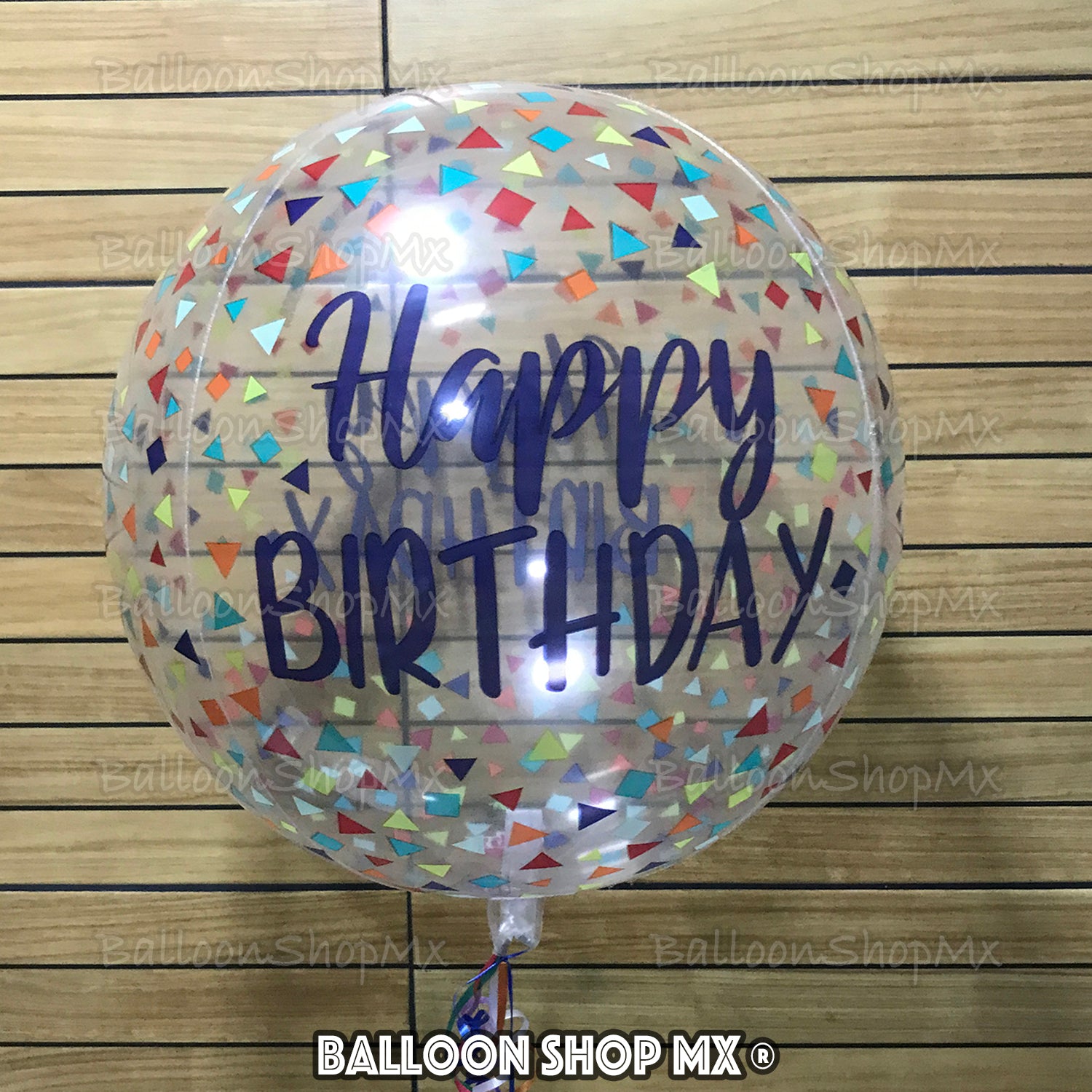 Burbuja transparente con la frase de "Happy Birthday" al centro de dos caras. El resto del globo esta decorado con un impreso en triángulitos de colores simulando confeti.
