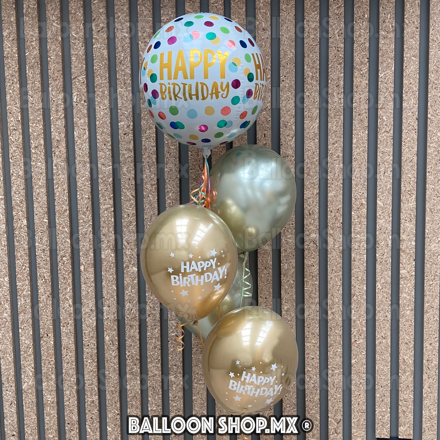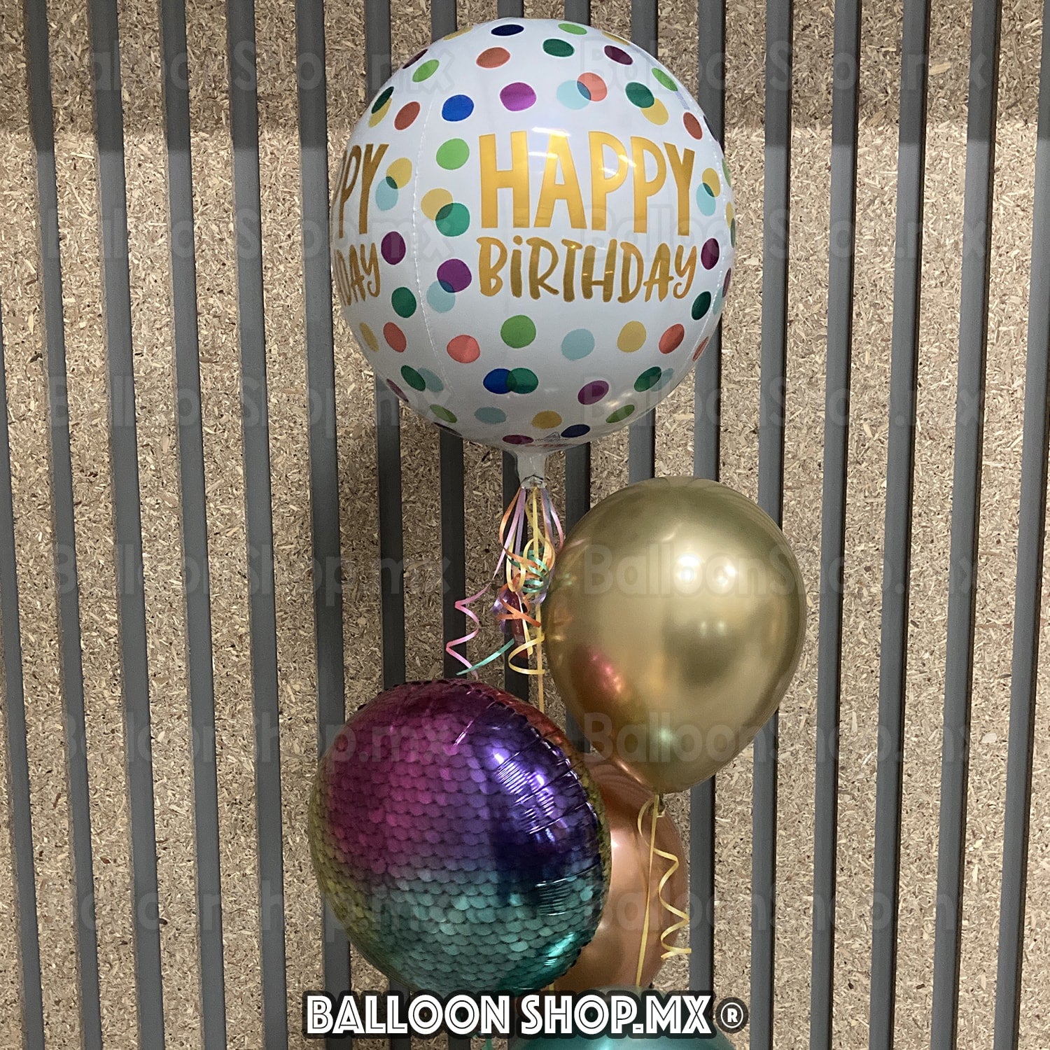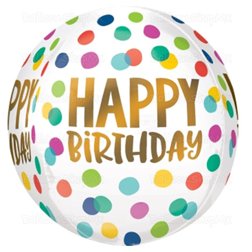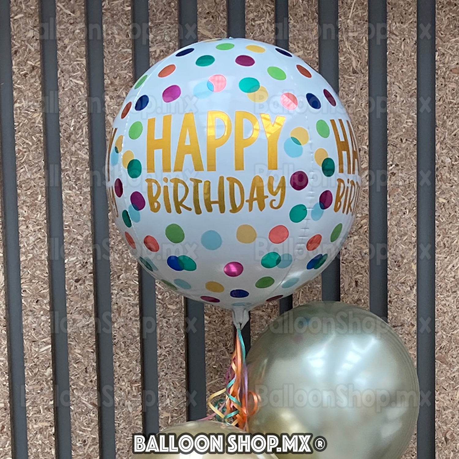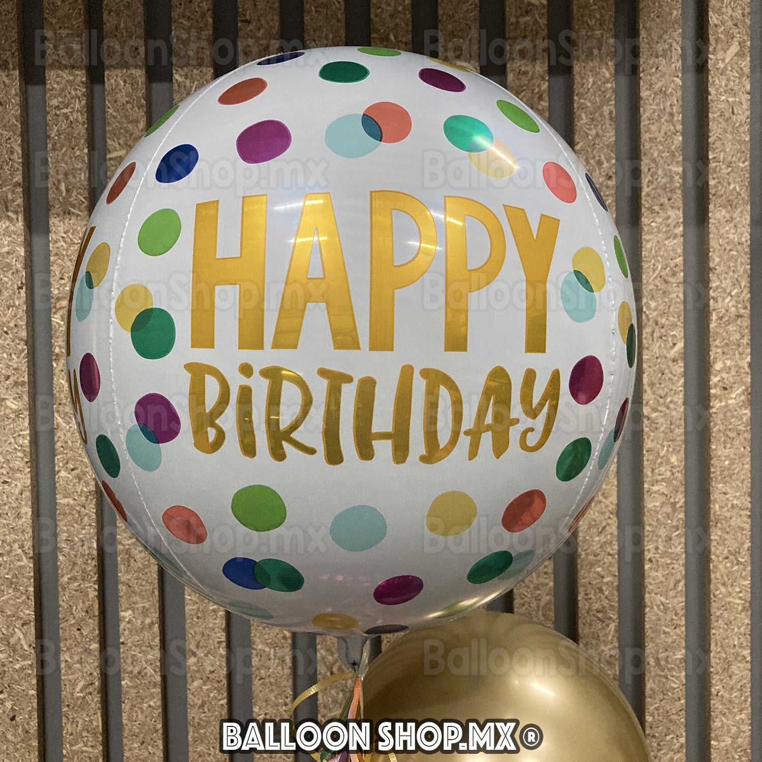 Burbuja de color blanco mate decorada con círculos de colores simulando confeti en varios tonos de colores. Al centro de las 4 caras del globo la frase "Happy Birthday" en color dorado satinado.