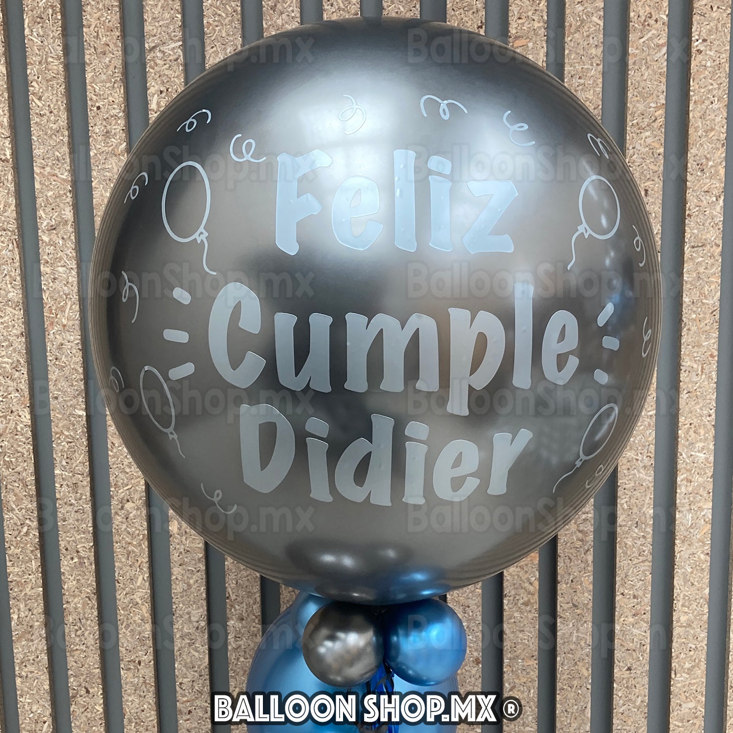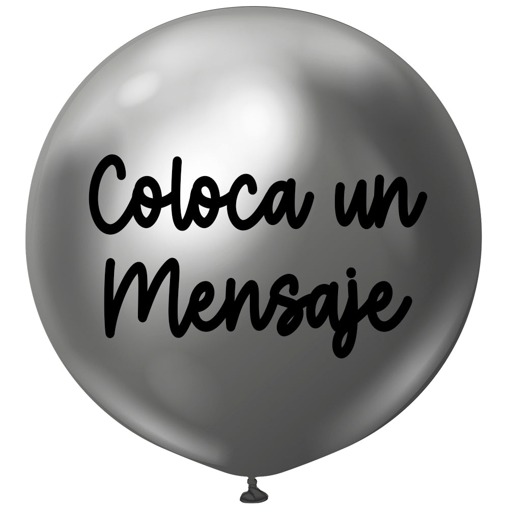 Globo burbuja de 55 centímetros de diámetro en acabado cromado grafito. Este globo cuenta con un mensaje personalizado en vinil del color de su elección a 2 caras.