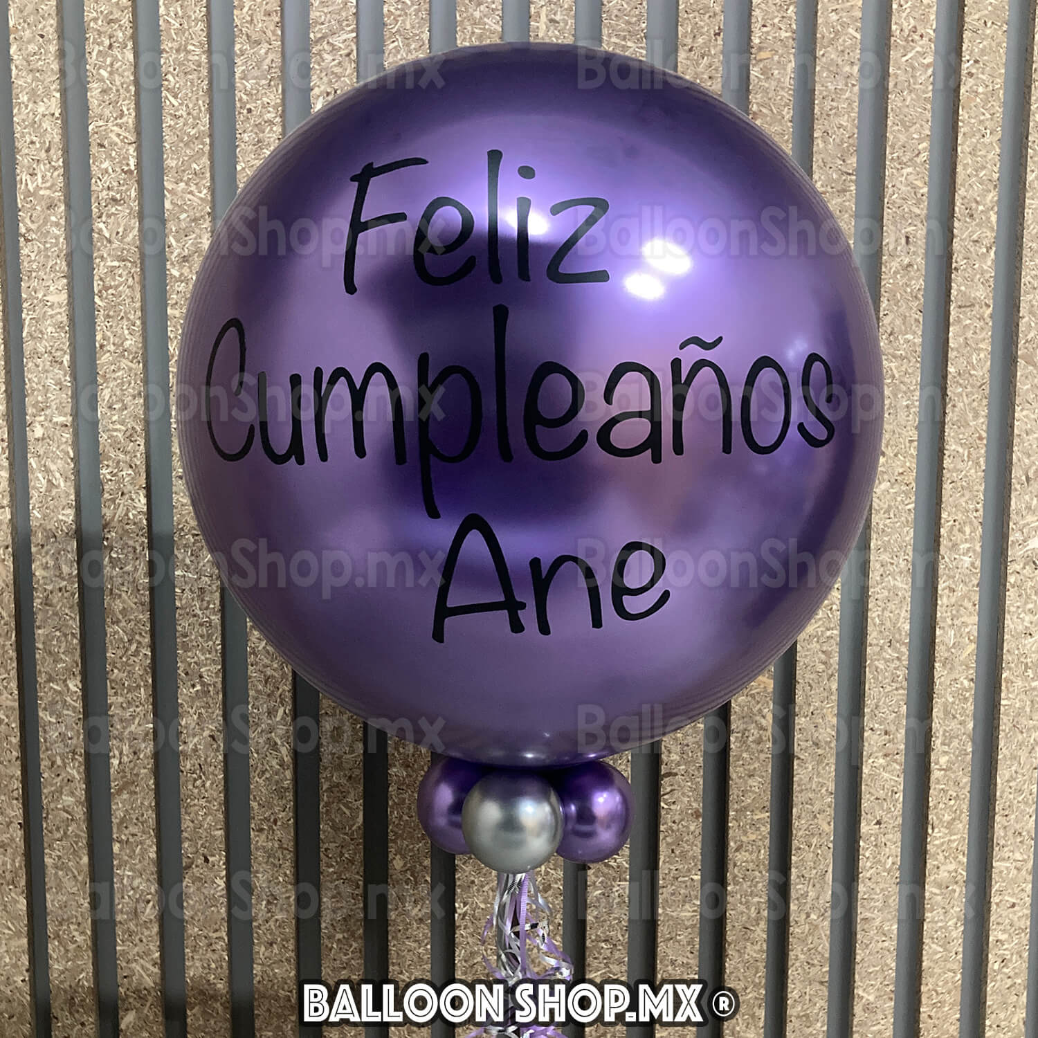 Globo burbuja de 55 centímetros de diámetro en acabado cromado morado. Este globo cuenta con un mensaje personalizado en vinil a 2 caras.