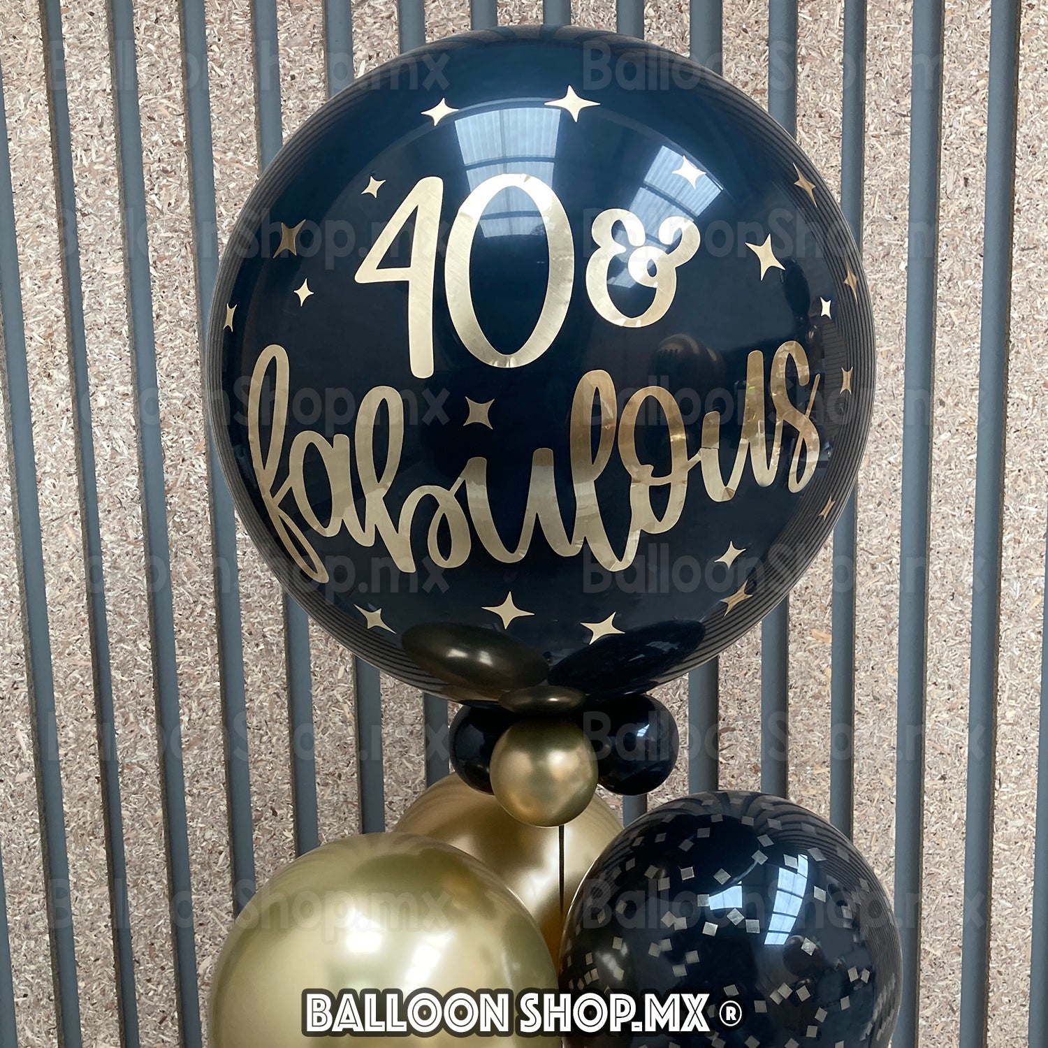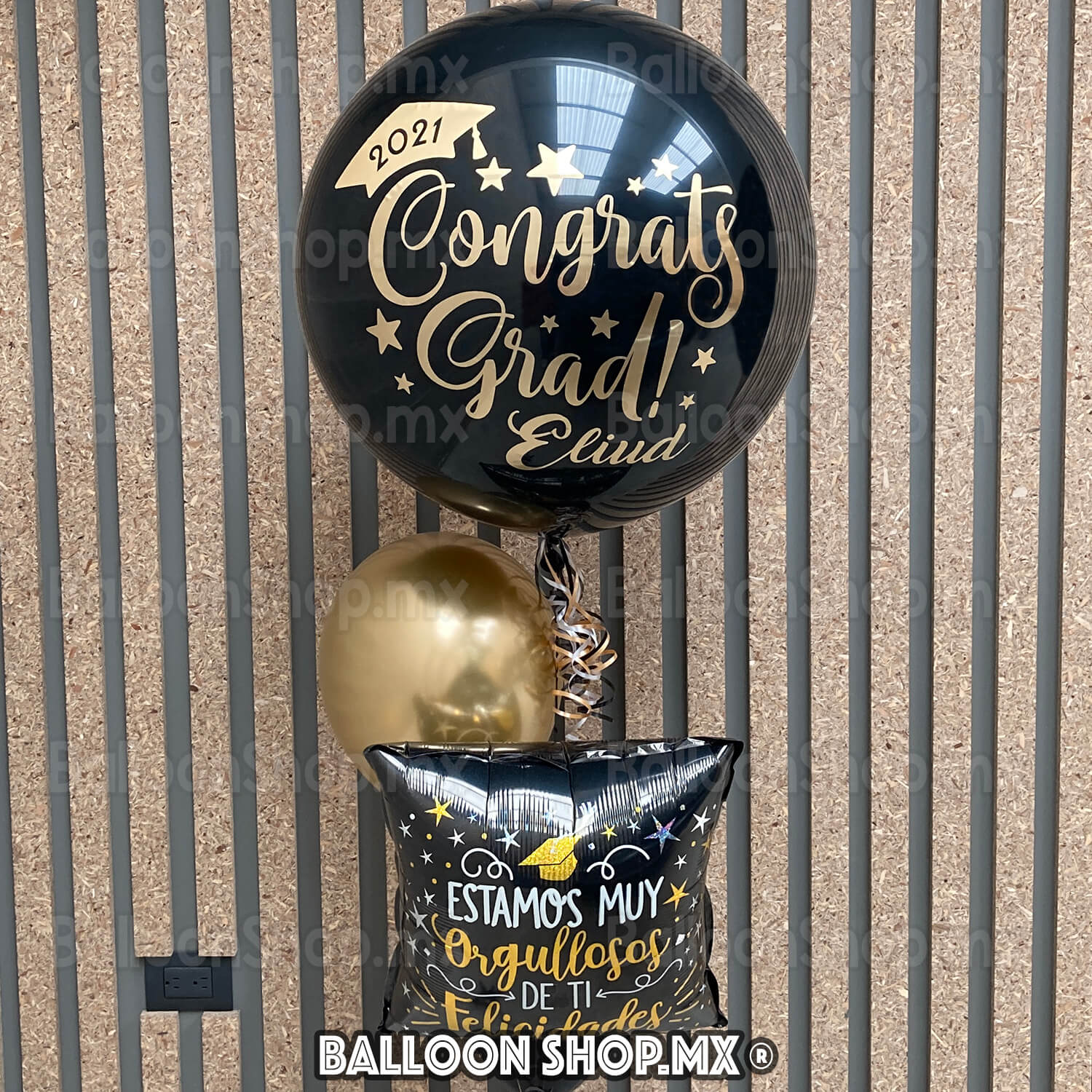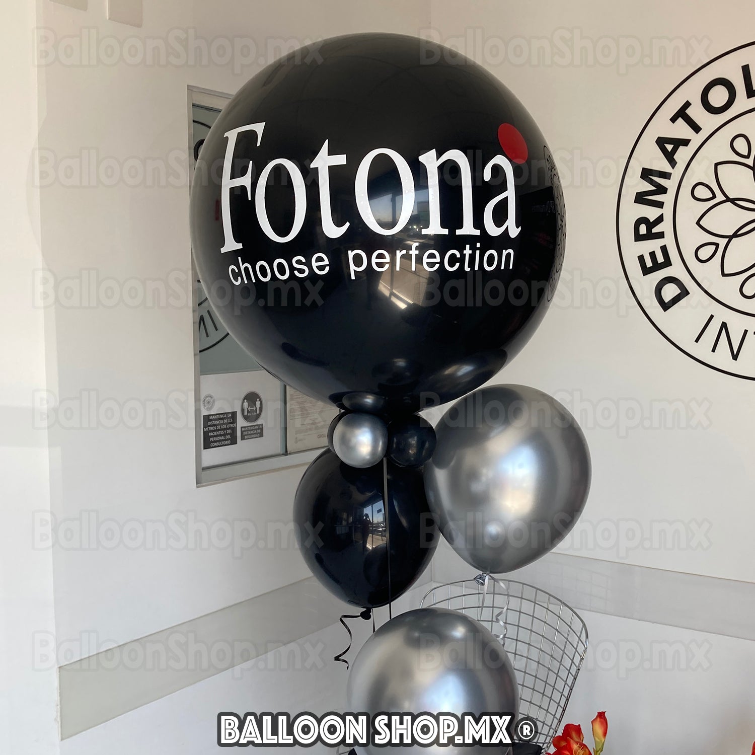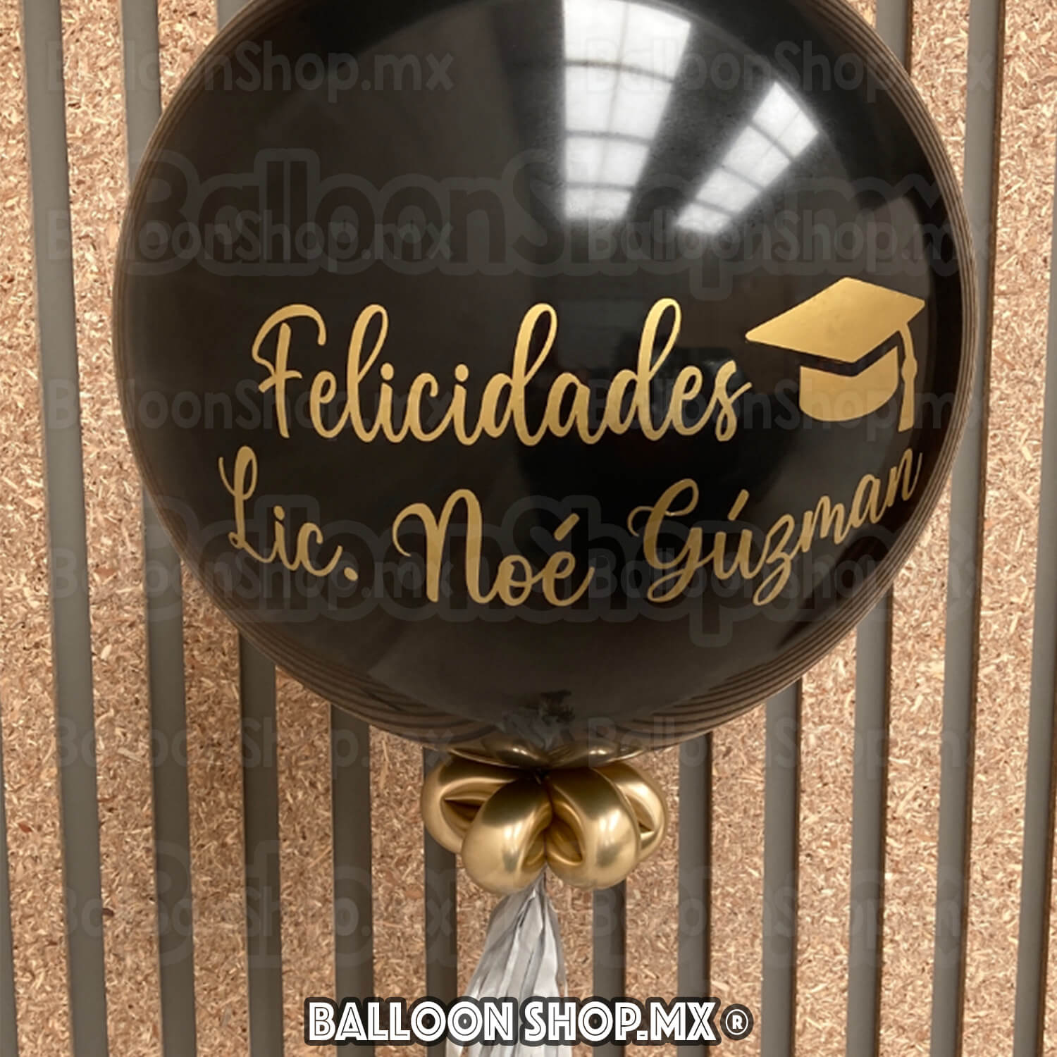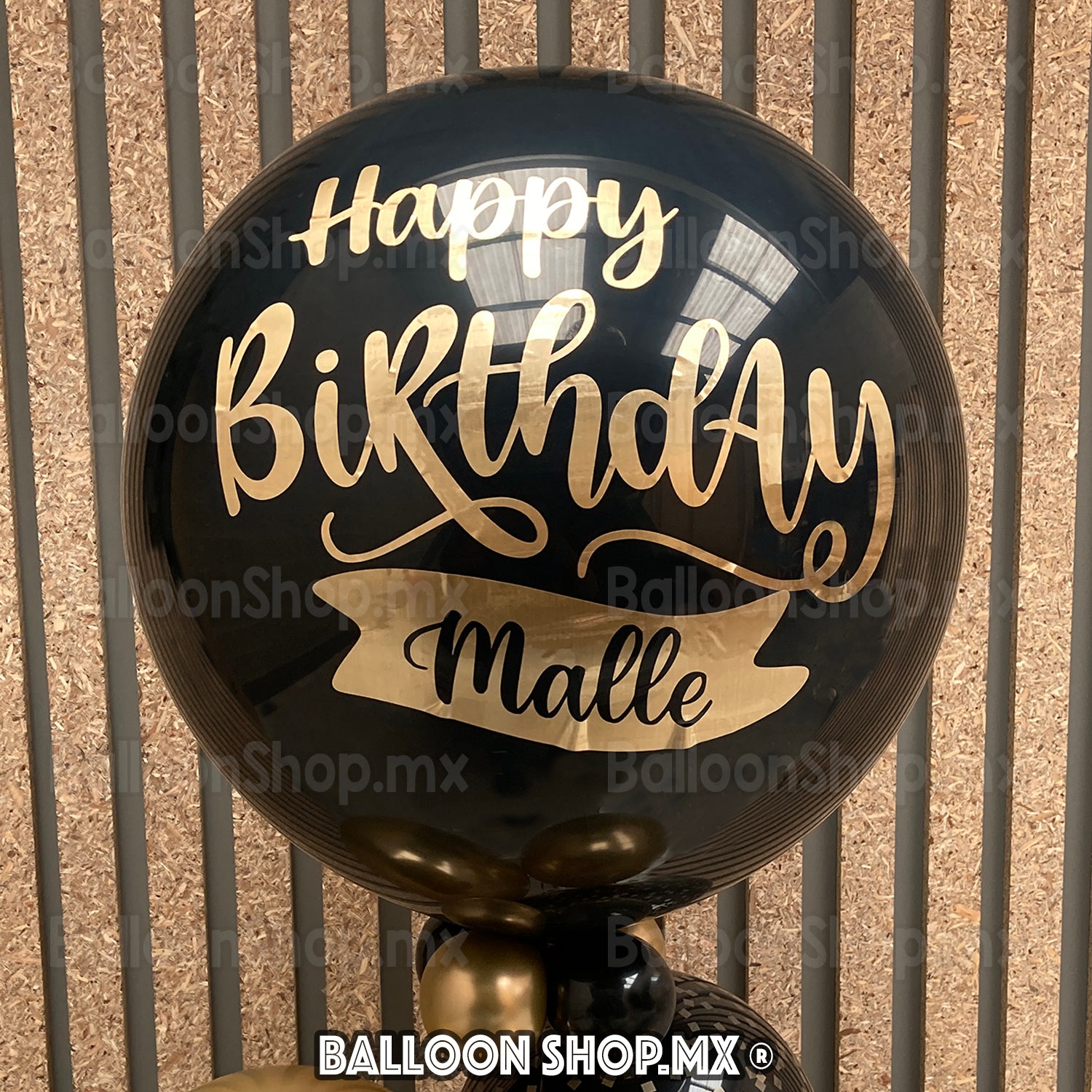 Globo burbuja de 55 centímetros de diámetro en acabado cromado color negro. Este globo cuenta con un mensaje personalizado en vinil del color de su elección a 2 caras.