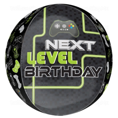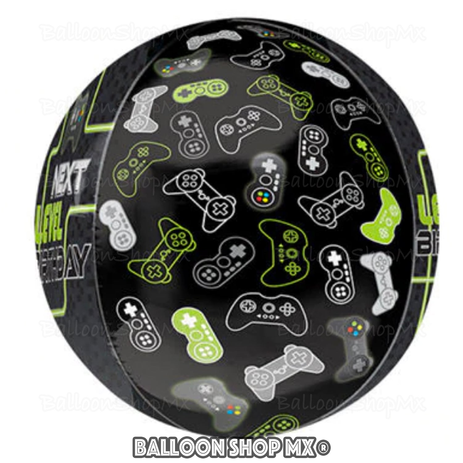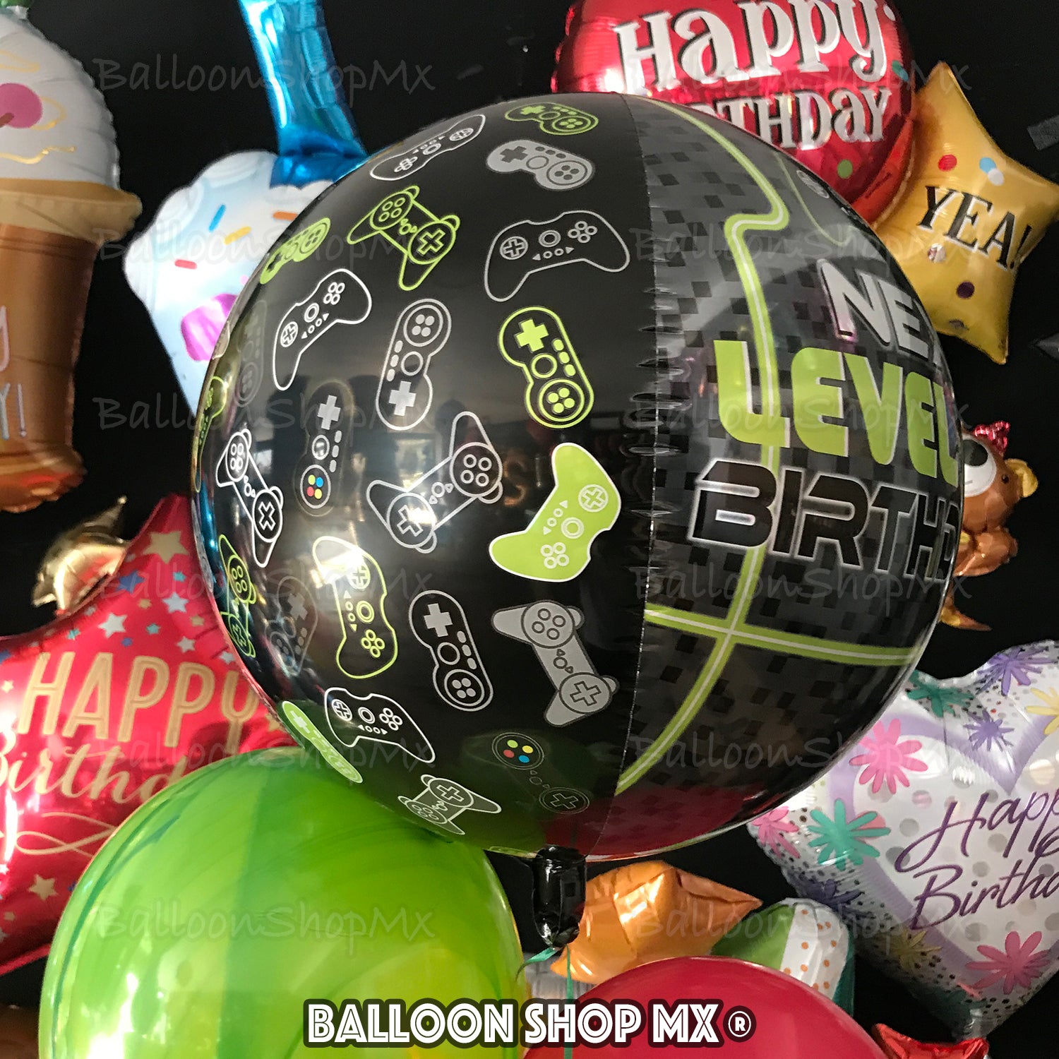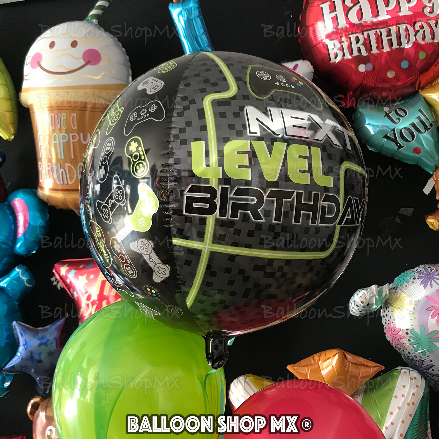 Este globo burbuja color negro con vistos en verde neón. En dos caras trae la leyenda "Next Level Birthday" debajo de un control de videojuego, en las otras dos caras restantes trae impresos controles remotos de distintas consolas en colores gris, verde, negro.