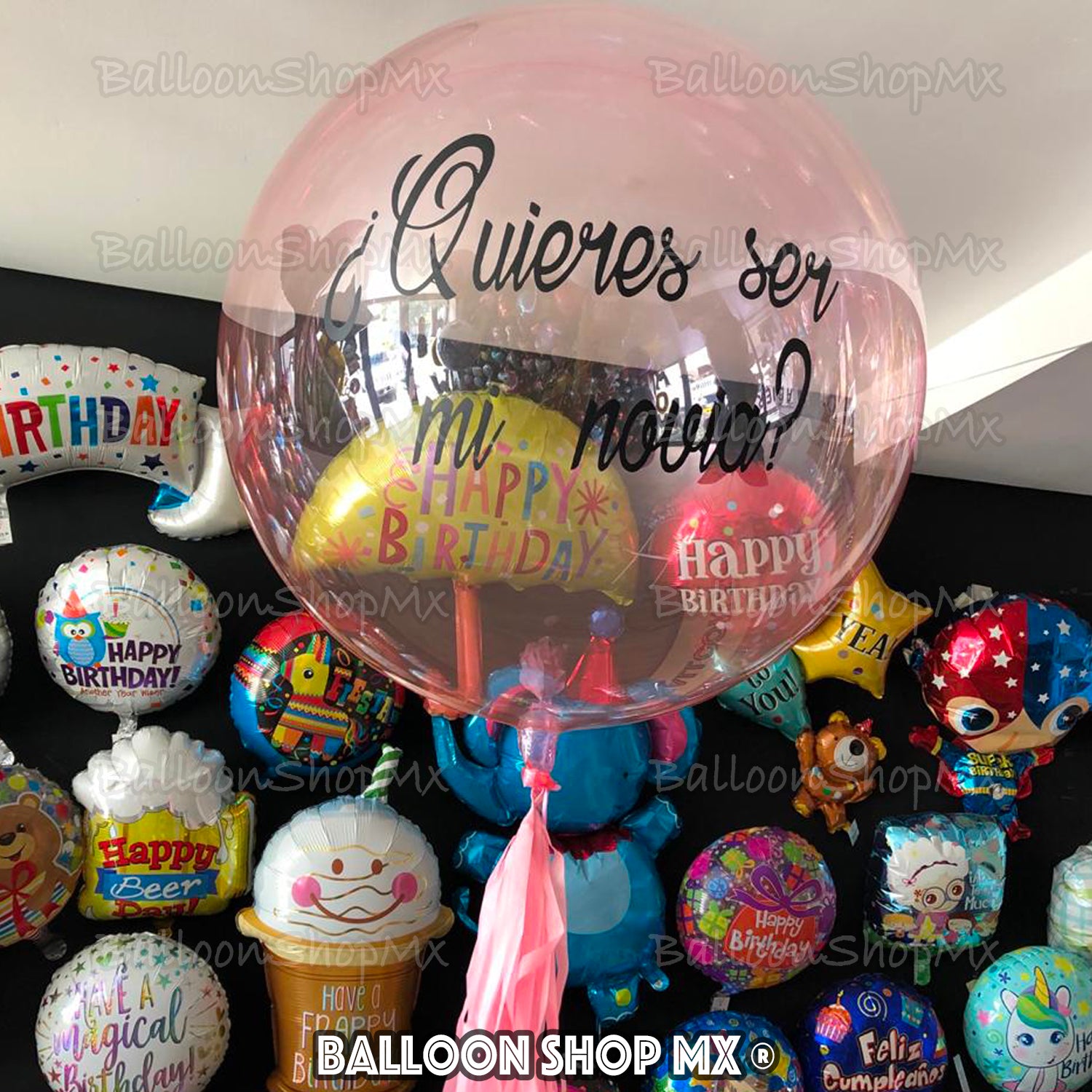 Globo burbuja de 55 centímetros en color rosa. Este globo cuenta con un mensaje personalizado en vinil.