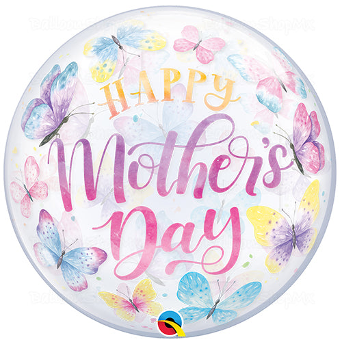 Globo burbuja transparente en tonos pastel y degradados con la frase "Happy Mother's Day". El resto esta decorado con mariposas también en tonos pasteles y degradados.