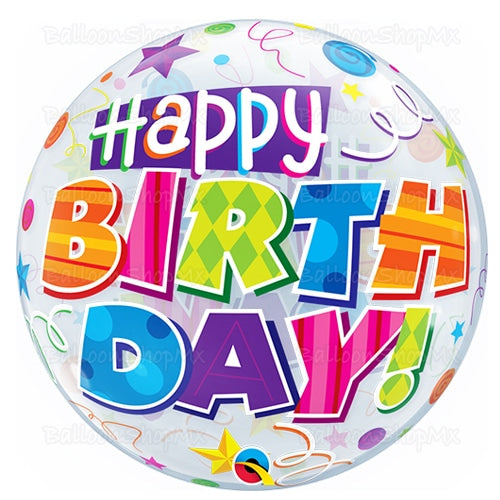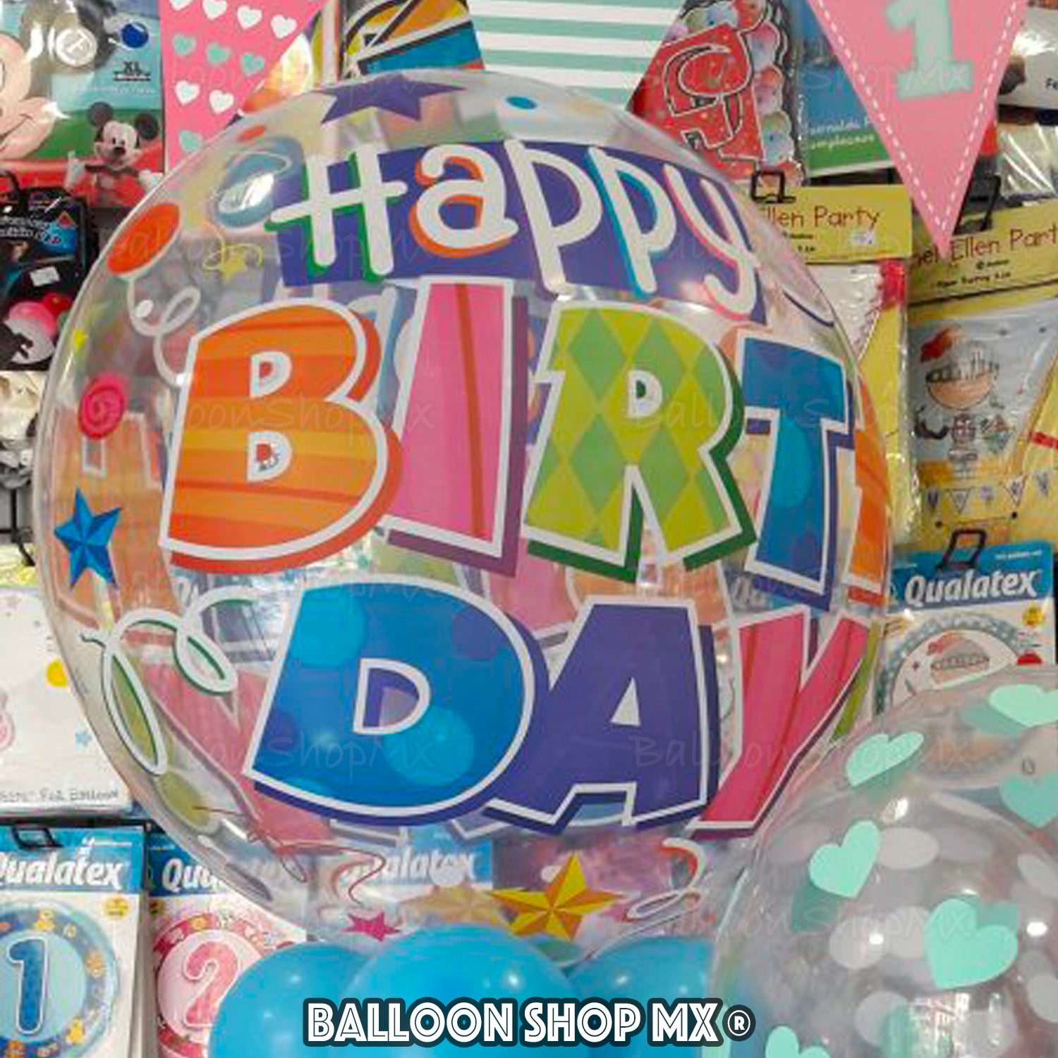 Globo transparente de tipo burbuja con un diseño moderno en colores vivos y frase gigante de "Happy Birthday!" en dos caras, el resto del globo esta tapizado con iconos de fiesta también en colores vivos.
