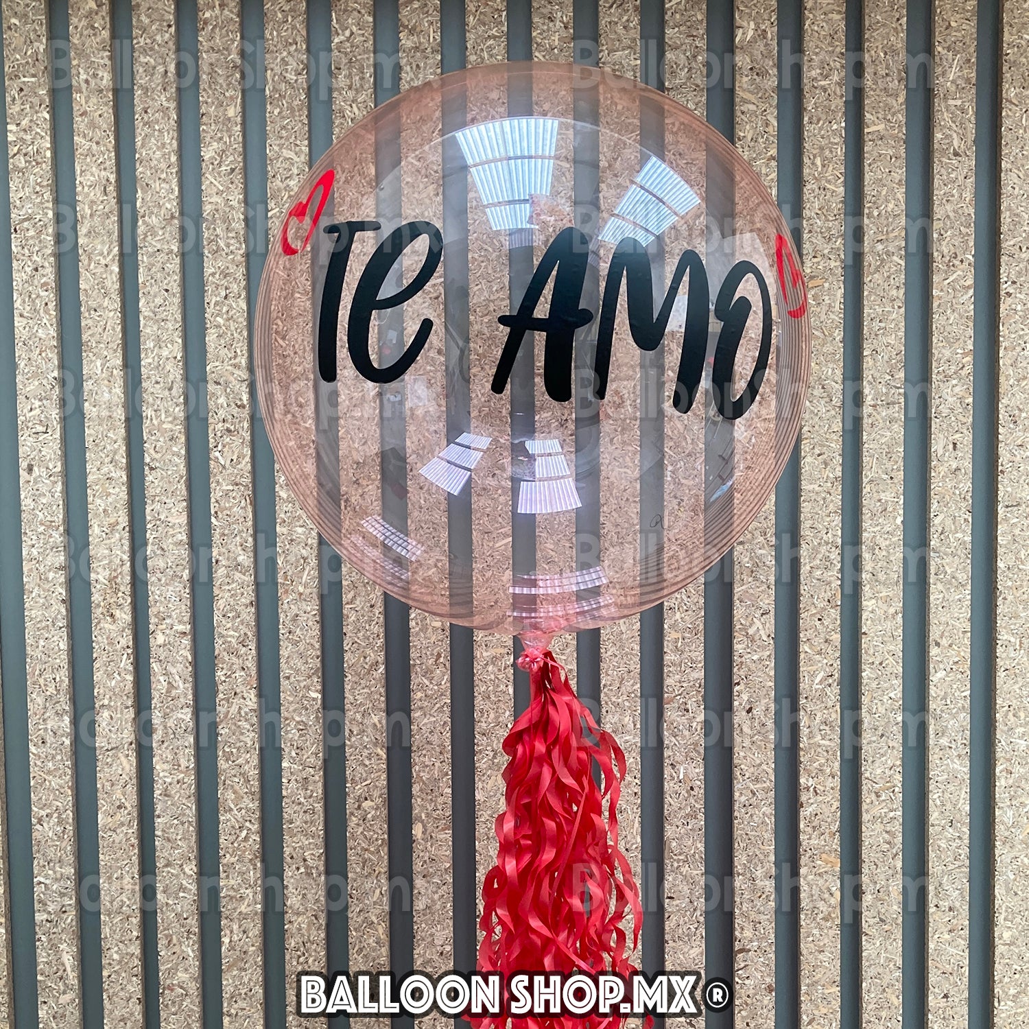 Globo burbuja cristal de 55 cm de diámetro en color rosa. Este globo cuenta con un mensaje personalizado en vinil.