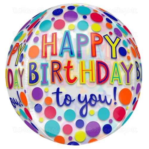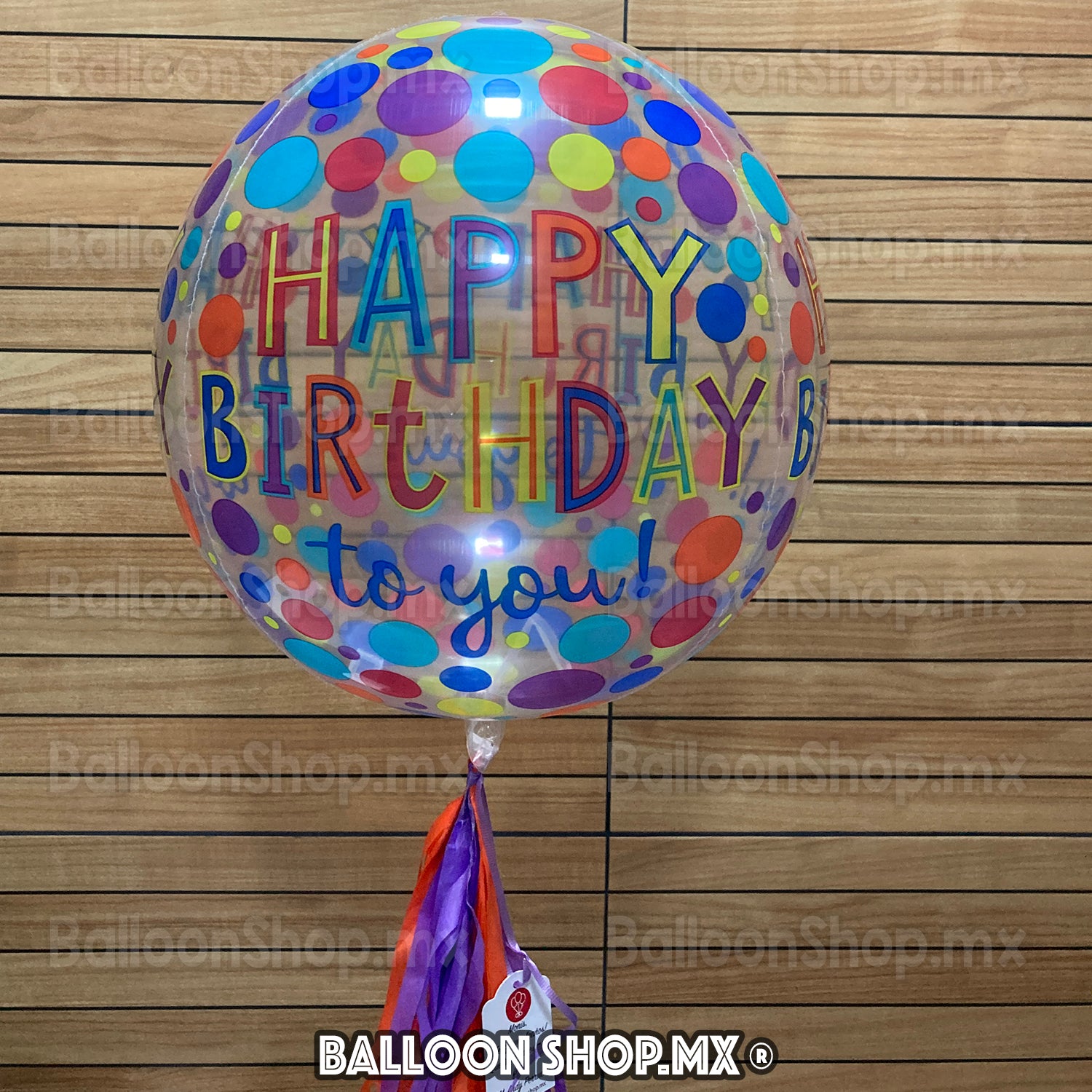 Burbuja transparente impresa con la frase "Happy Birthday to you" en las 4 caras del globo con una tipografía de color y un delineado de otro tono. El resto del globo viene decorado con círculos de distintos tamaños y colores.