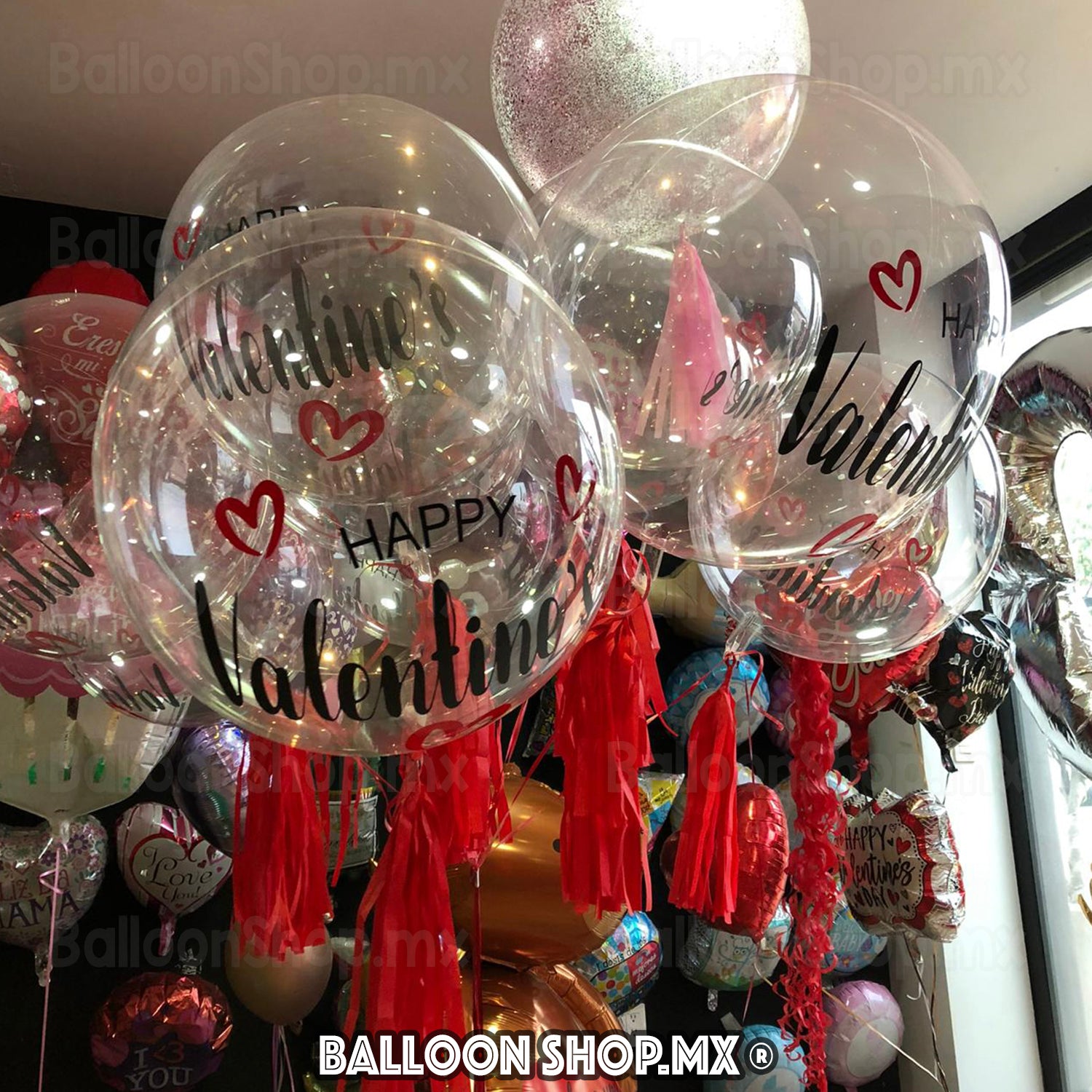 Globo burbuja de 55 centímetros en color transparente con mensaje en vinil "Happy Valentine's Day" en color negro y unos corazones en color rojo.