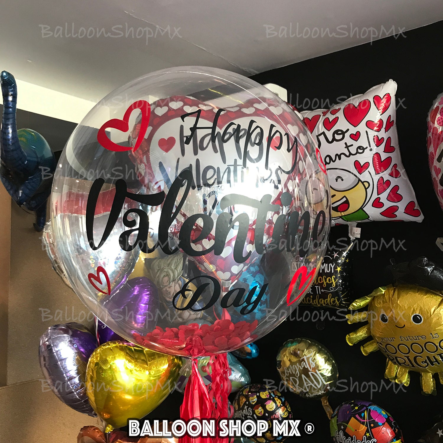 Globo burbuja de 55 centímetros en color transparente rotulado con la frase "Happy Valentine's Day" en vinil color rojo y una flecha en dorado metálico. Dentro del globo hay confeti redondo suelto color rojo.