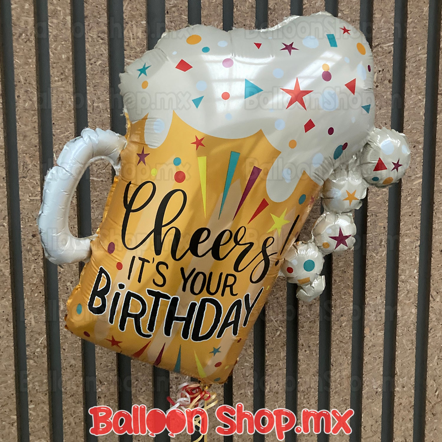 Globo en forma de tarro de cerveza con la frase "Cheers! It's your birthday", en la espuma y en el resto del globo trae un decorado simulando confeti de colores con formas como círculos, estrellas, triángulos, etc.