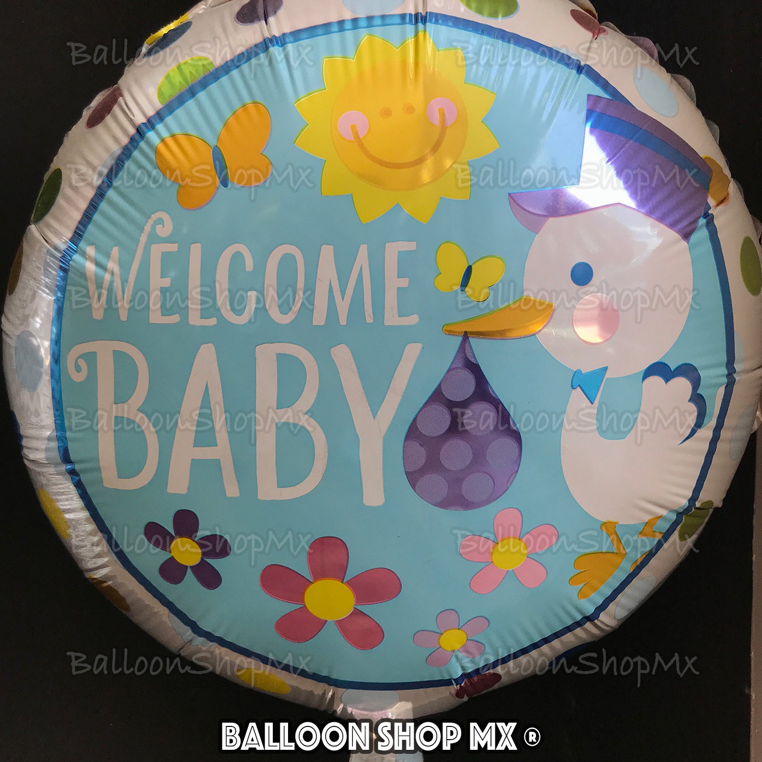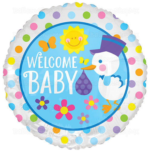 Globoredondo en color plata decorado con círculos de colores y al centro en un circulo azul la imagen de una cigueñita haciendo una entrega y la frase "Welcome Baby" decorado con flores, mariposas y el sol.