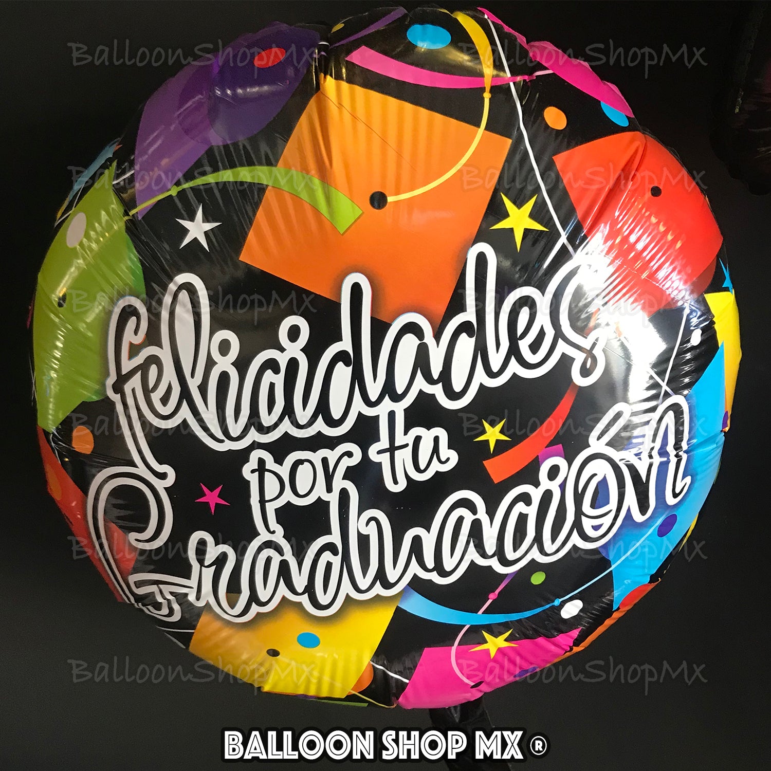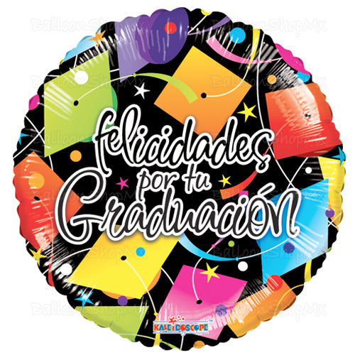 Globo redondo de 18" en color negro decorado con un collage de birretes de colores y al centro la frase "Felicidades por tu Graduación!".