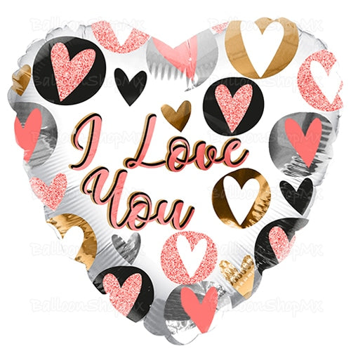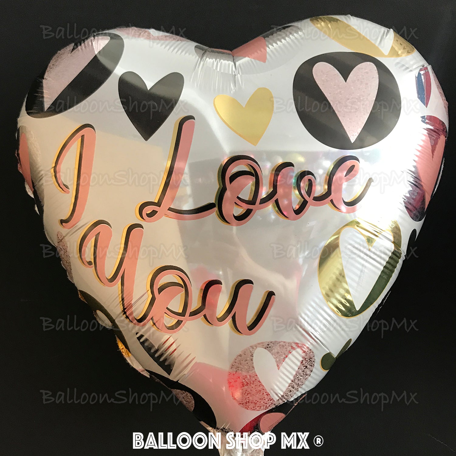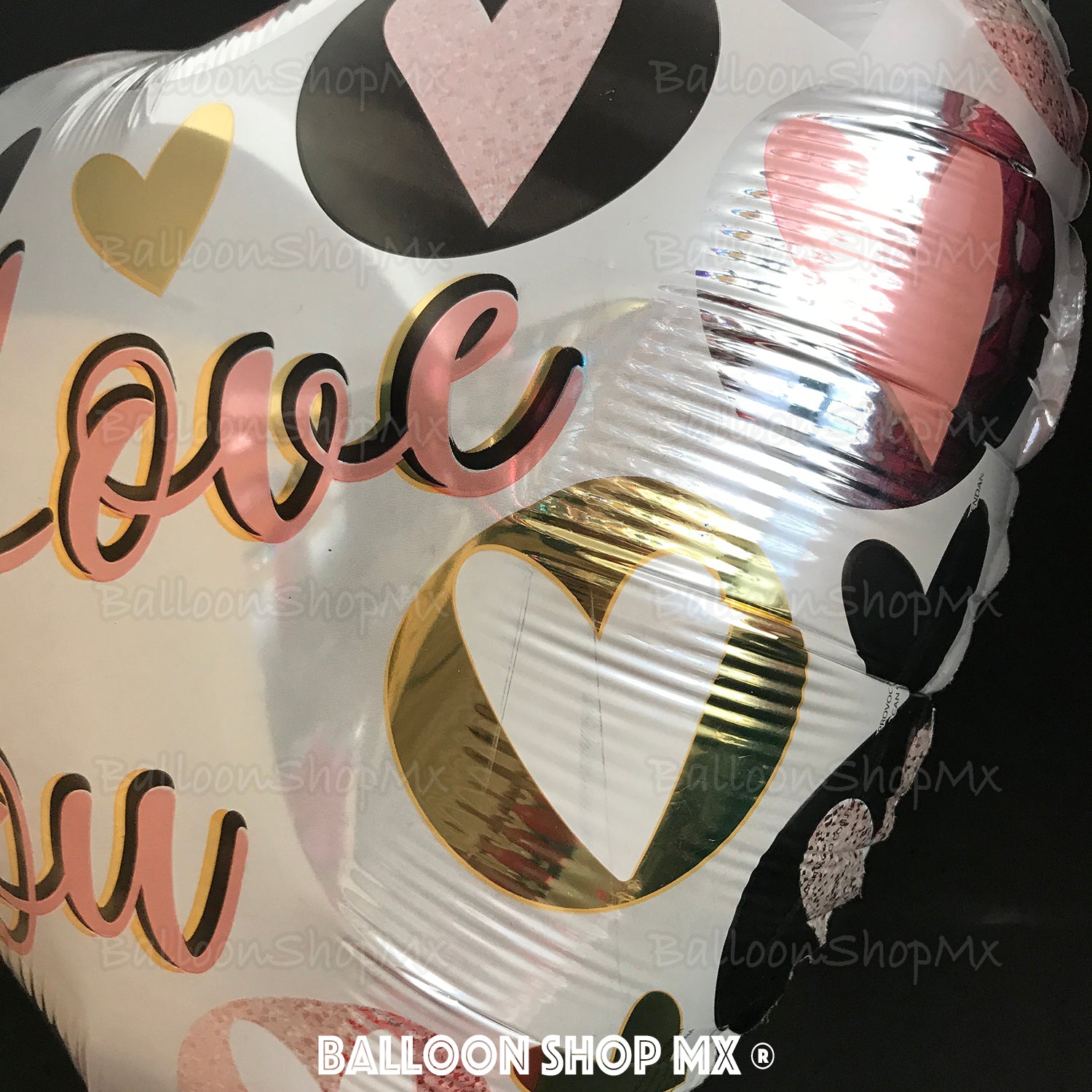 Globo en forma de corazón color blanco, con la frase "I love you" en oro rosa al centro, el resto del globo esta decorado por múltiples corazones de colores metálicos y algunos holográficos, como dorado, rosa, negro, plata, etc.