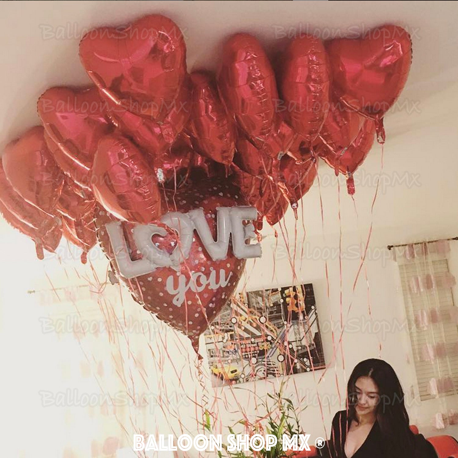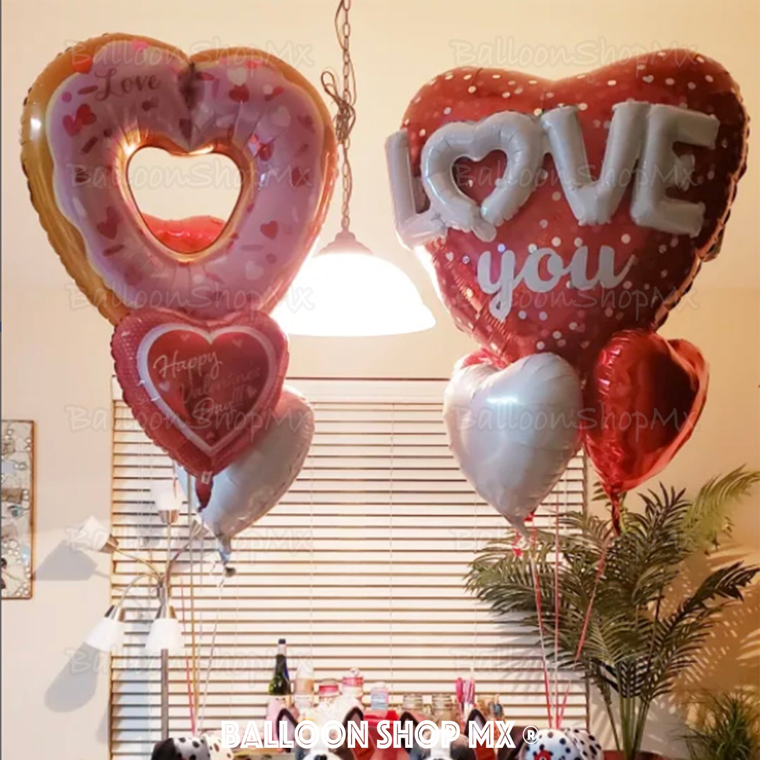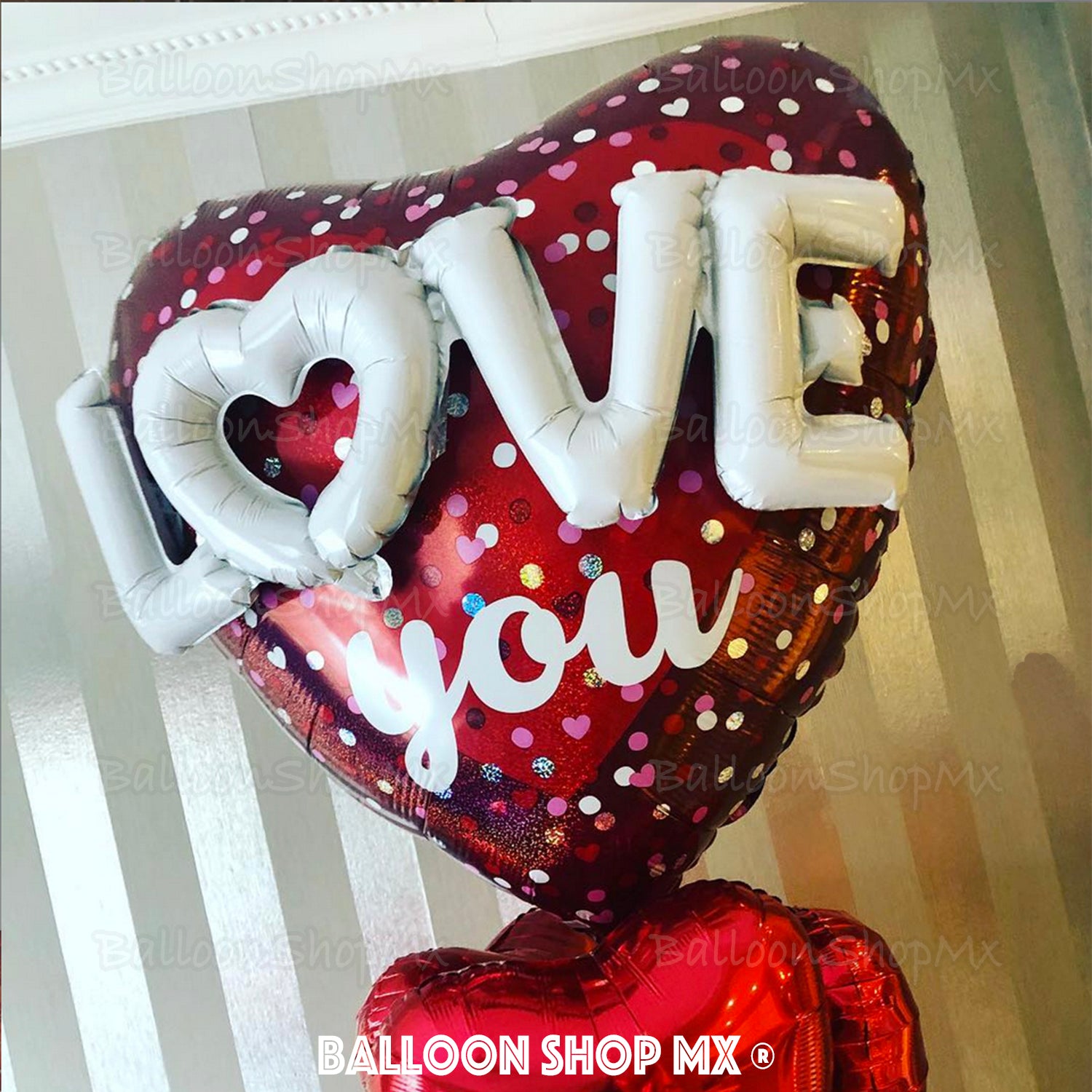 Corazón gigante en color rojo holográfico con un banner tridimensional con la frase "Love" en color blanco en ambas caras. El fondo del globo viene en dos tonos de rojos y decorado con círculos y corazones de varios colores.