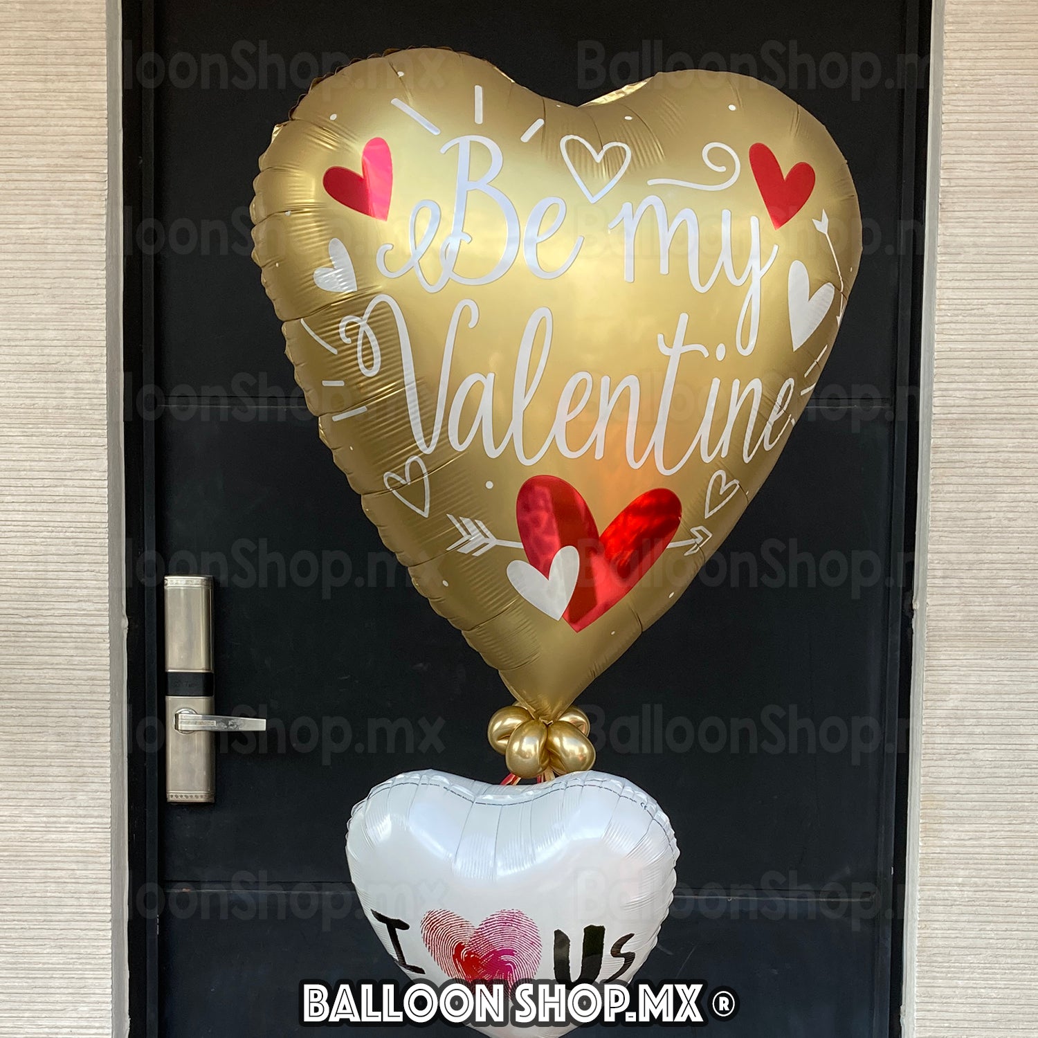 Corazón gigante color dorado mate decorado con corazones blancos y rojos, al centro la frase "Be my Valentine".