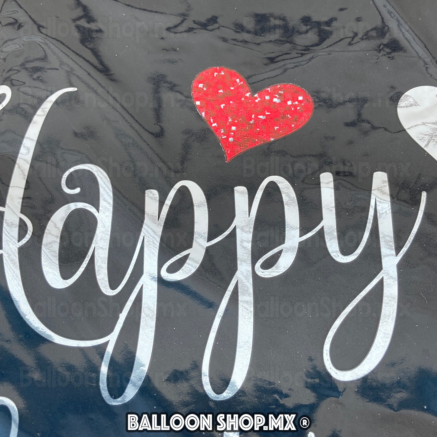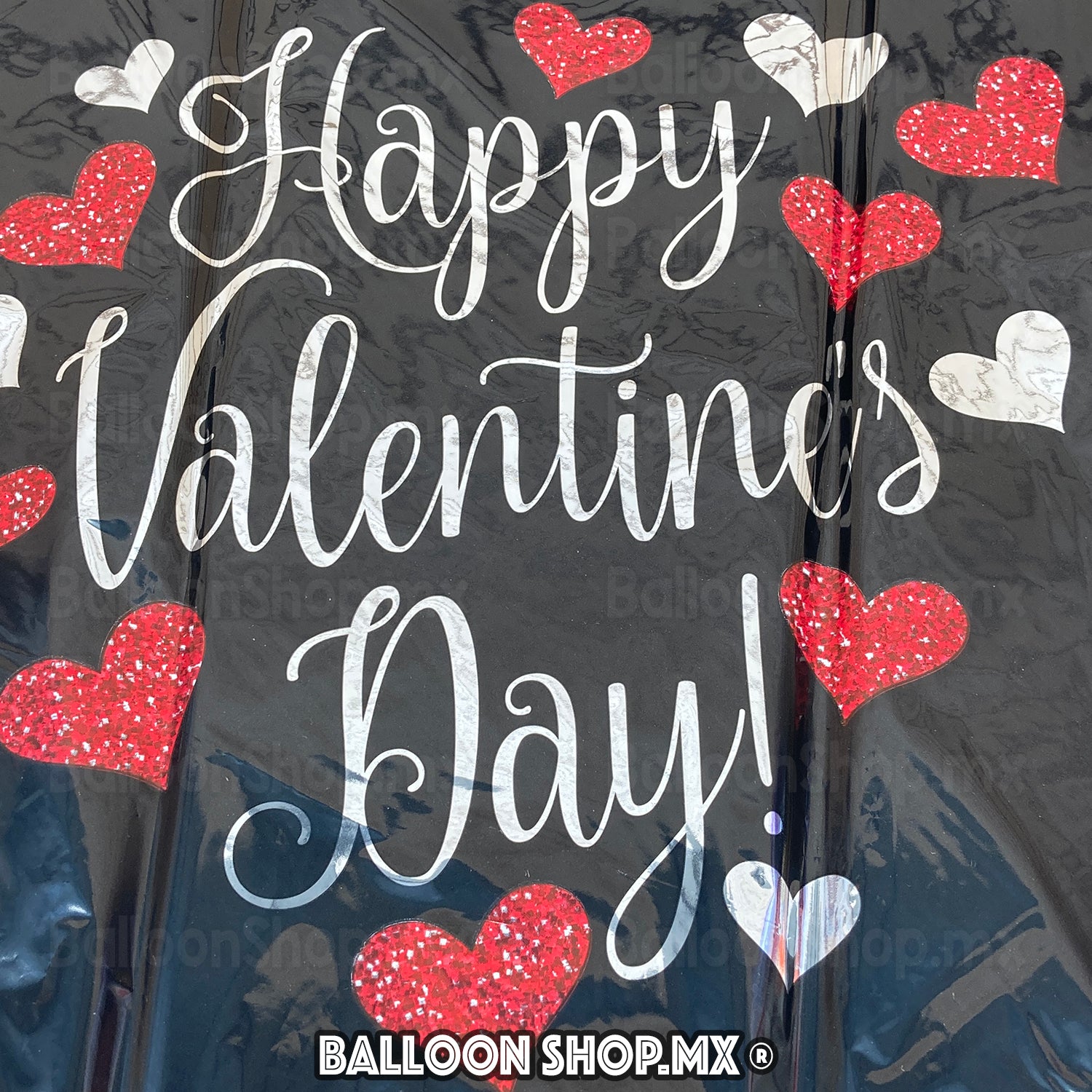 Corazón color negro decorado con corazones rojos y plata; al centro la frase "Happy Valentine's Day" también en plata.
