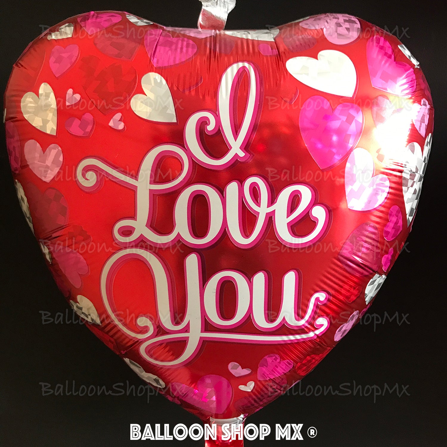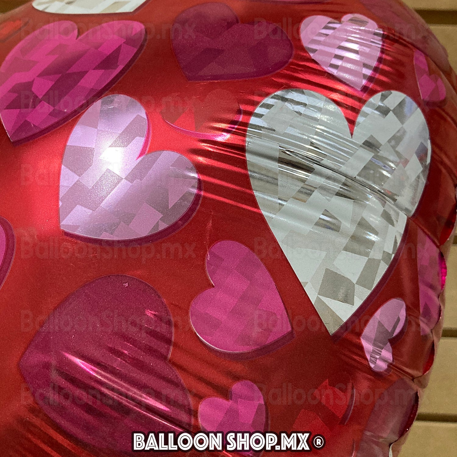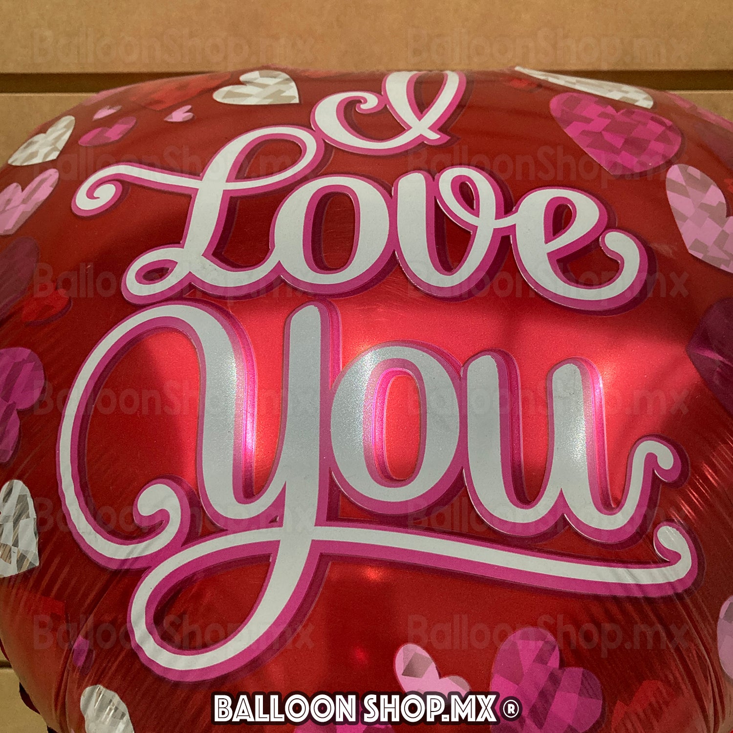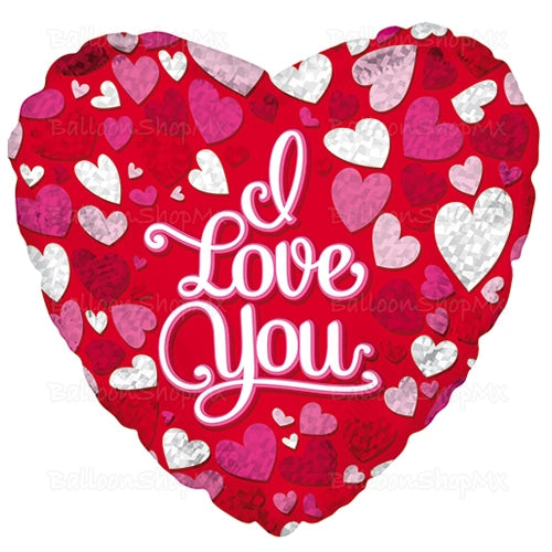 Globo en forma de corazón color rojo metálico decorado por múltiples corazones en tonos rojos, rosas y blancos con acabado holográfico que le añade muchísima vida, al centro la frase "I love you".