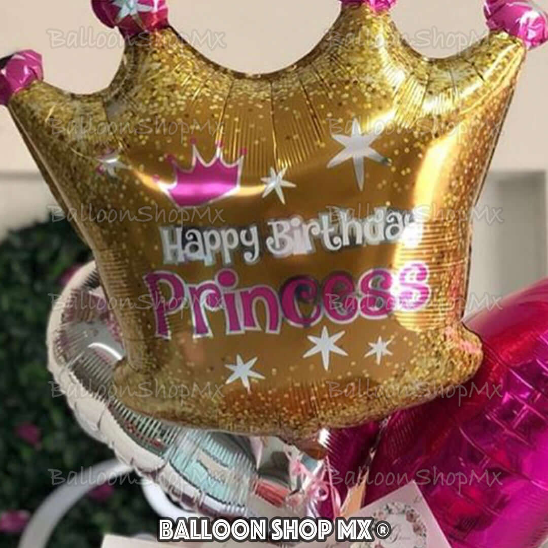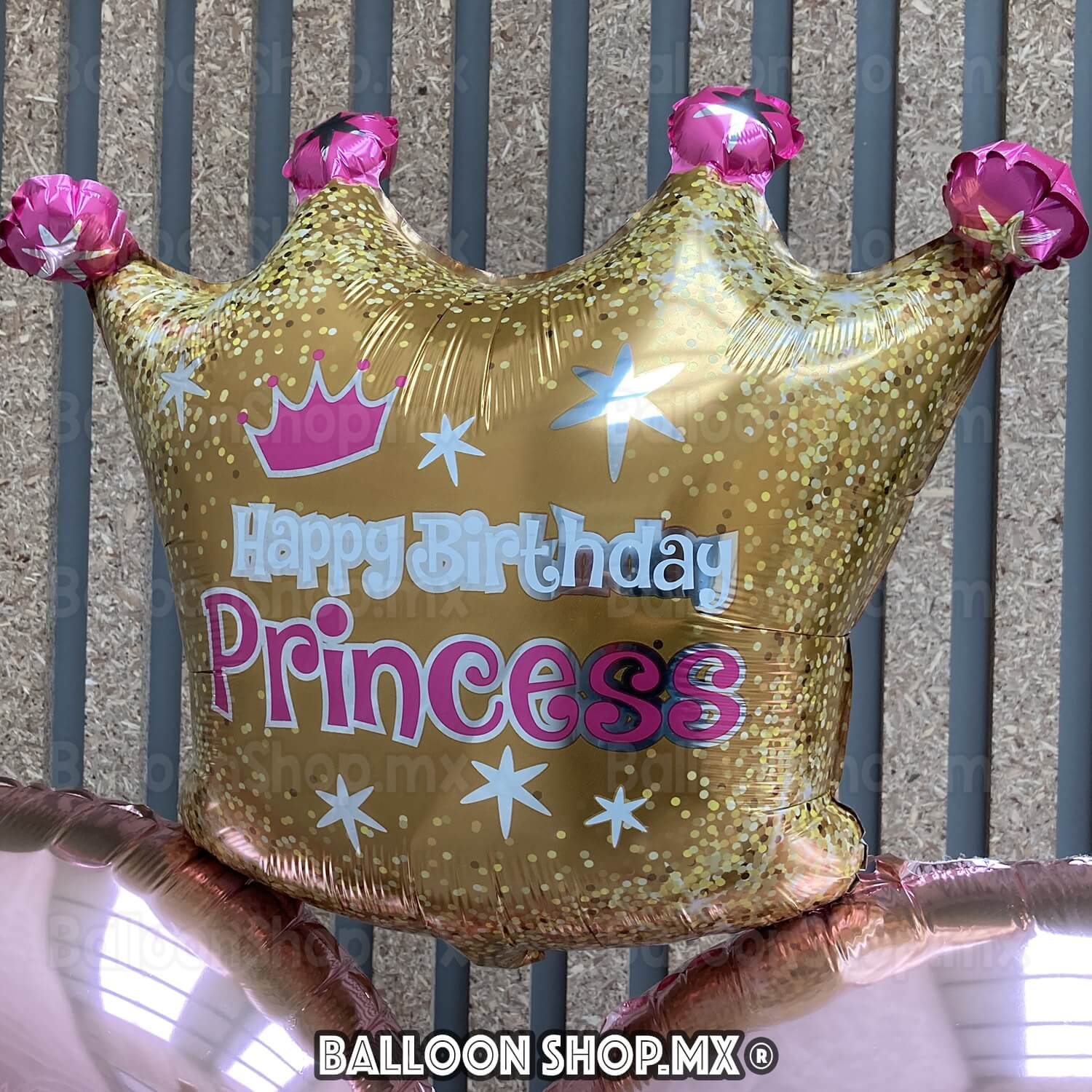 Globo en forma de corona en color dorado con detalles circulares en todo el contorno. Al centro la frase "Happy Birthday Princess" en las letras platas y rosas.