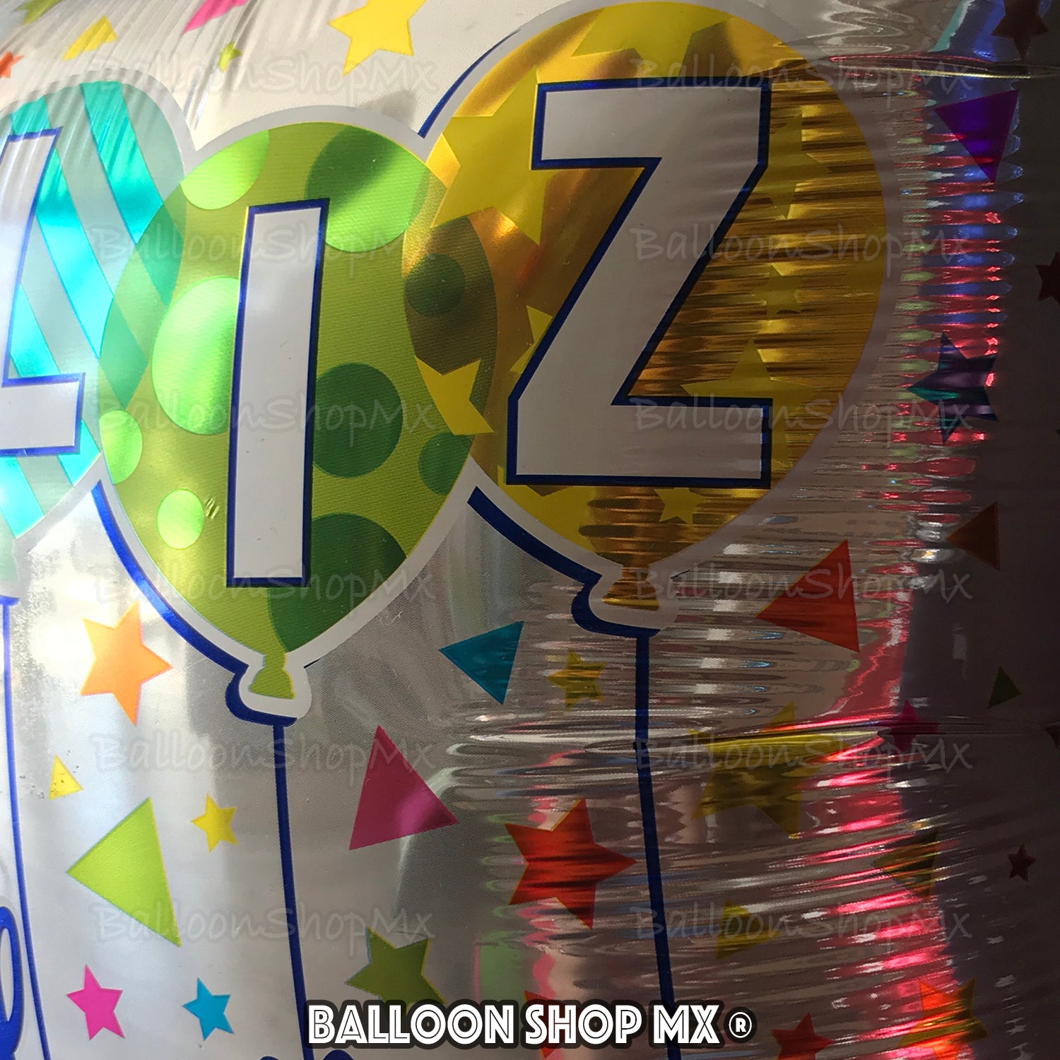 Globo cuadrado en color plata metálico. Al centro trae la frase "Feliz Cumpleaños", "feliz" impresa en 5 globos de colores y "cumpleaños" sujeta de ellos. El resto del globo viene decorado con estrellas y triángulos de colores.