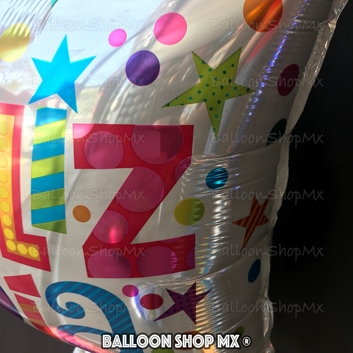 Globo en forma cuadrada en color plata metálico. En ambas caras trae la frase "Feliz Día" en varios colores y patrones. El resto del globo esta decorado con estrellas y confeti en colores metálicos.