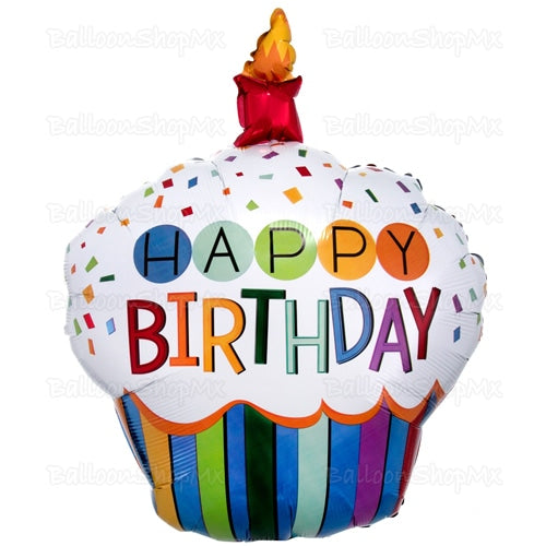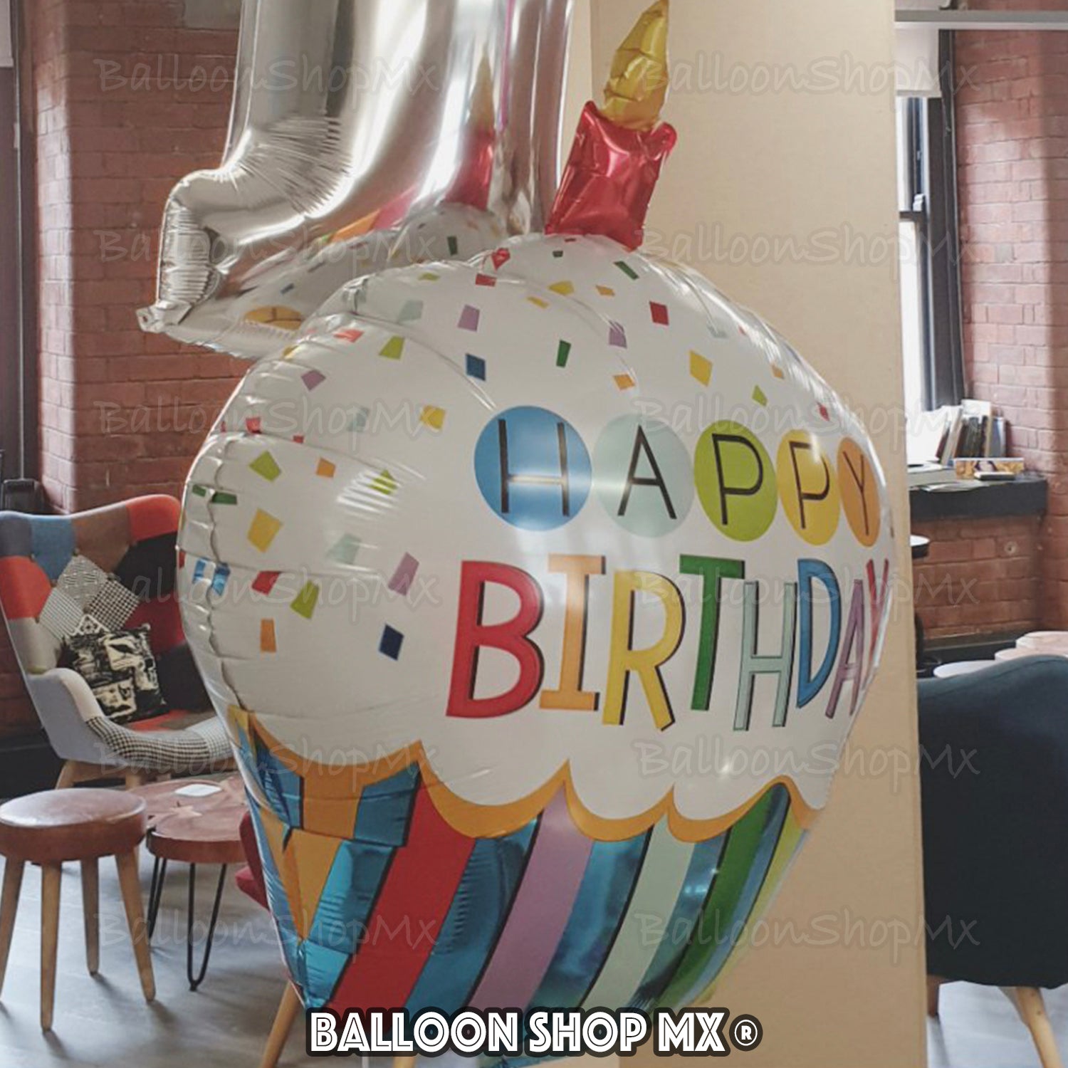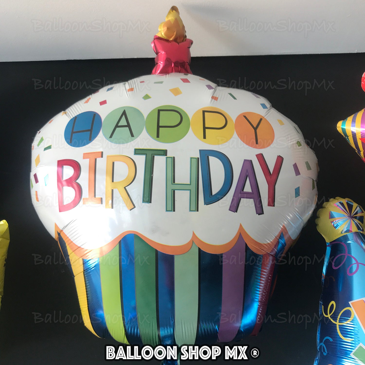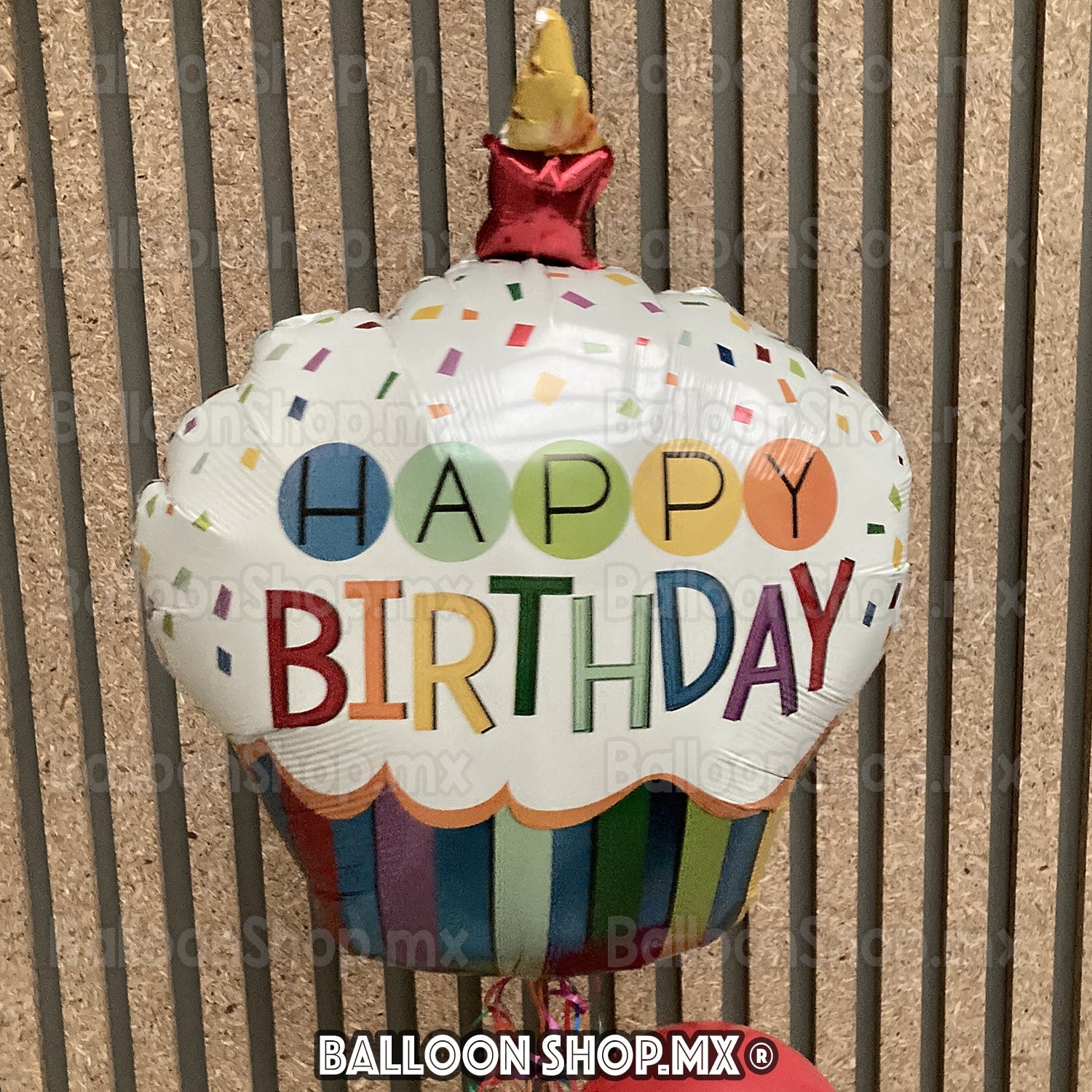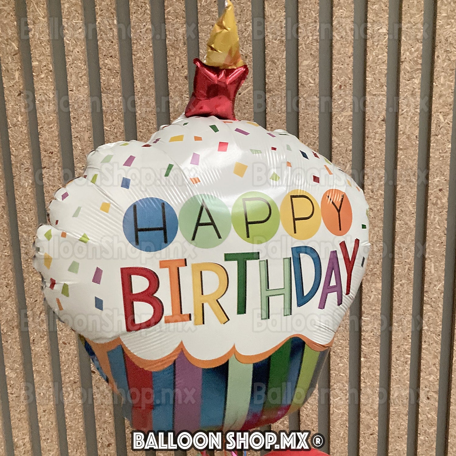 Globo en forma de cupcake, en la parte del pastel viene con el fondo blanco decorado con la frase "Happy Birthday" en letras de colores y cuadritos de colores como si fueran chispitas, en la parte inferior barras de colores con el azul como color principal, y hasta arriba el detalle de la velita.