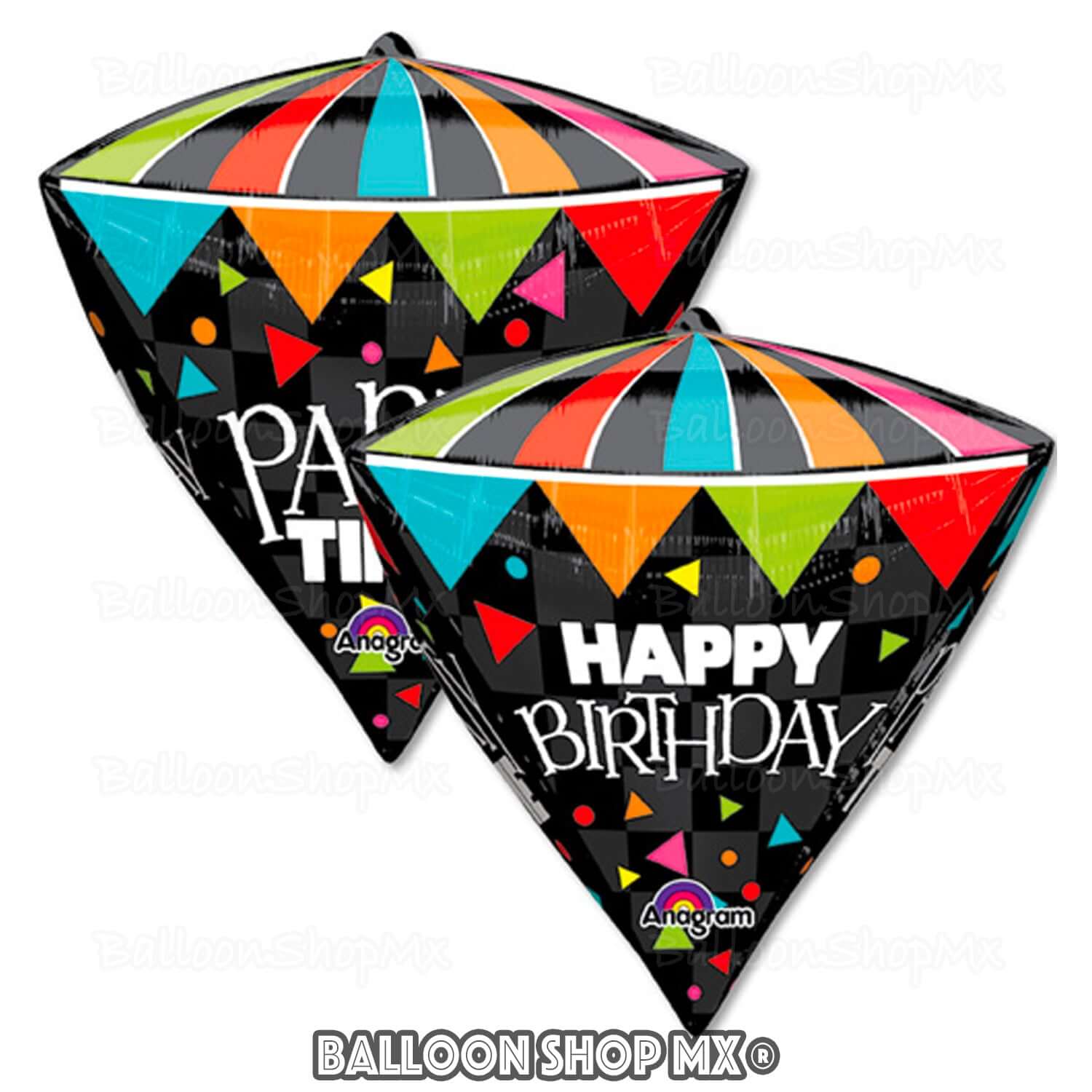 Globo negro en forma de diamante con vistos en colores metálicos brillantes. En 2 caras tiene la frase "Happy Birthday" y en 2 "Party Time", el resto del globo esta tapizado con triángulos de varios colores en distintos tamaños.