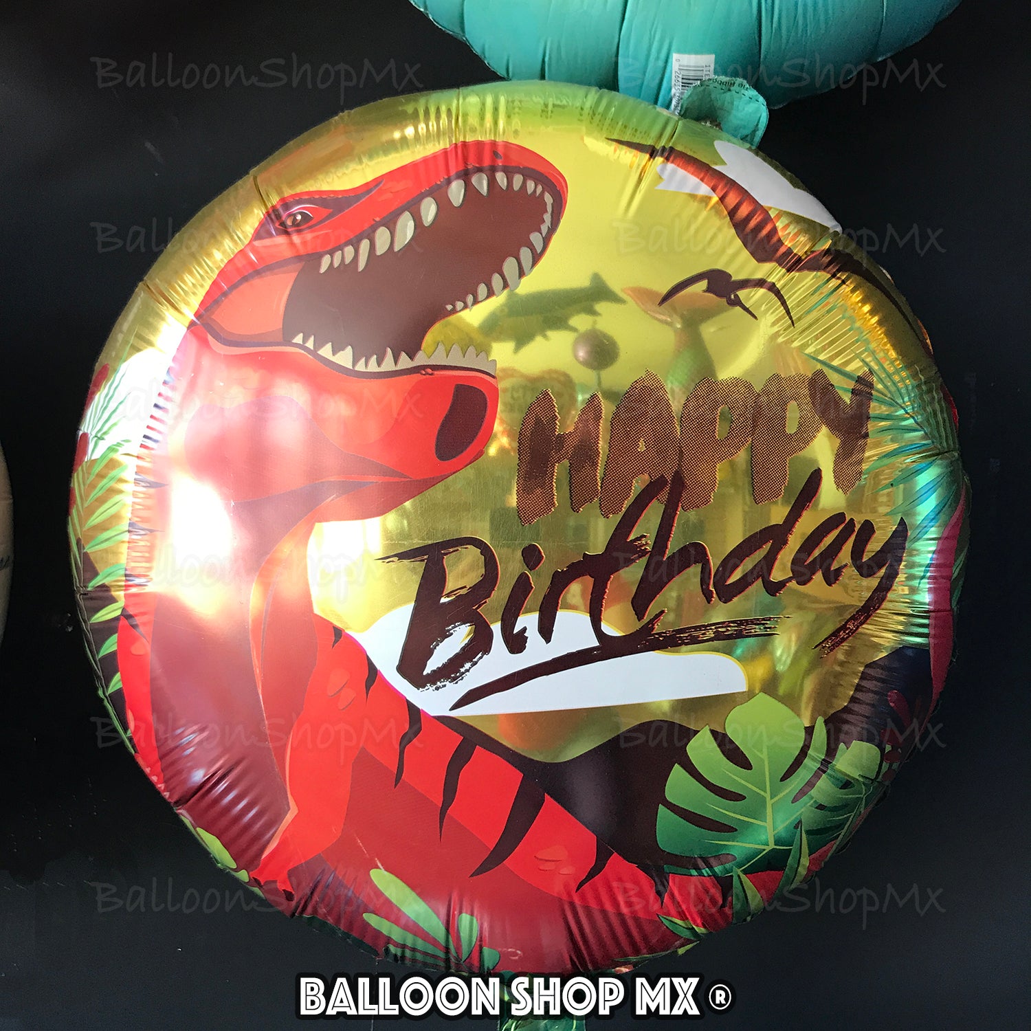 Globo redondo en color dorado metálico. Entre plantas hay un T-rex y unos pterodáctilos volando al fondo, al centro la frase "Happy Birthday".