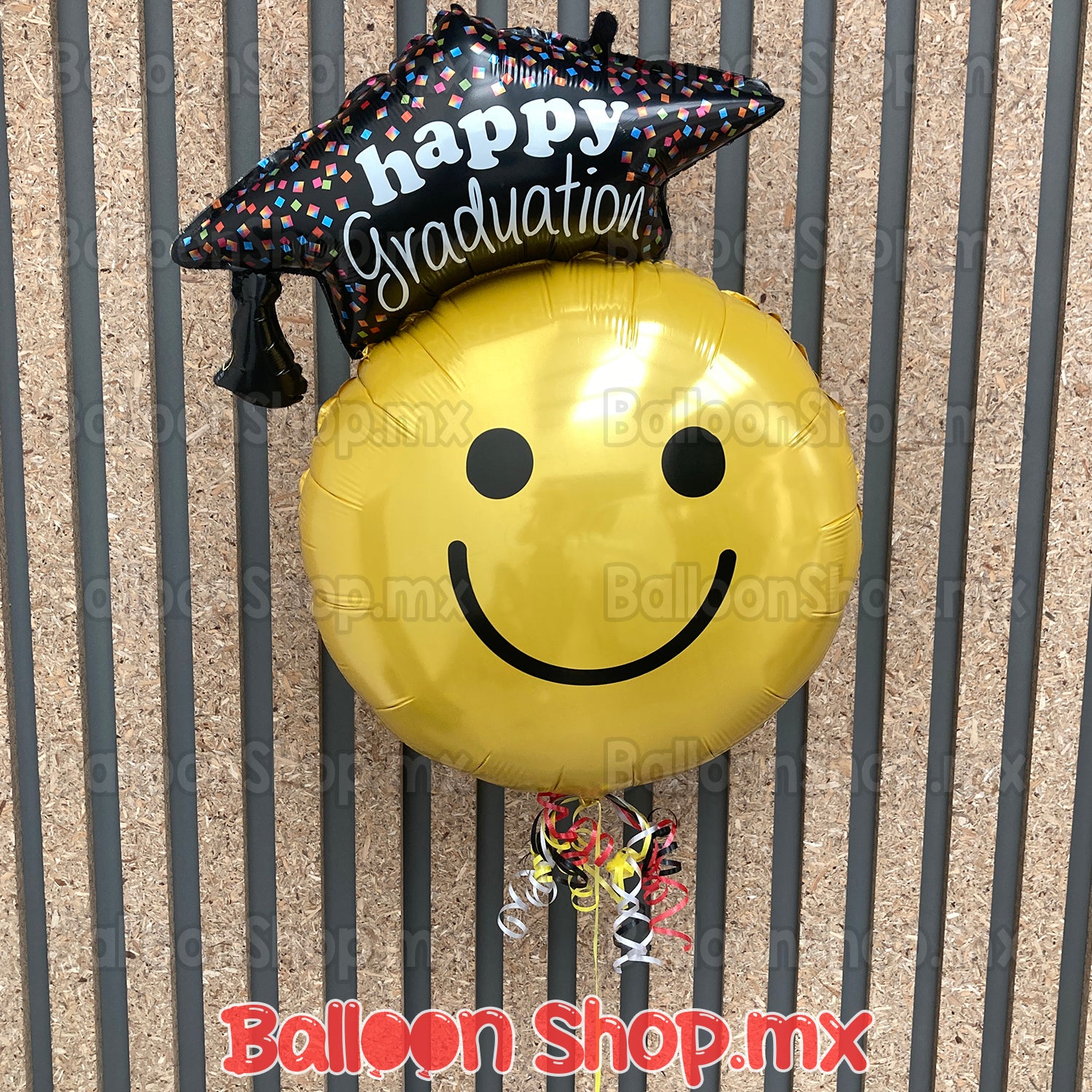 Globo grande con un emoji de carita feliz y un birrete con la frase "happy graduation" decorado con confetis de colores.