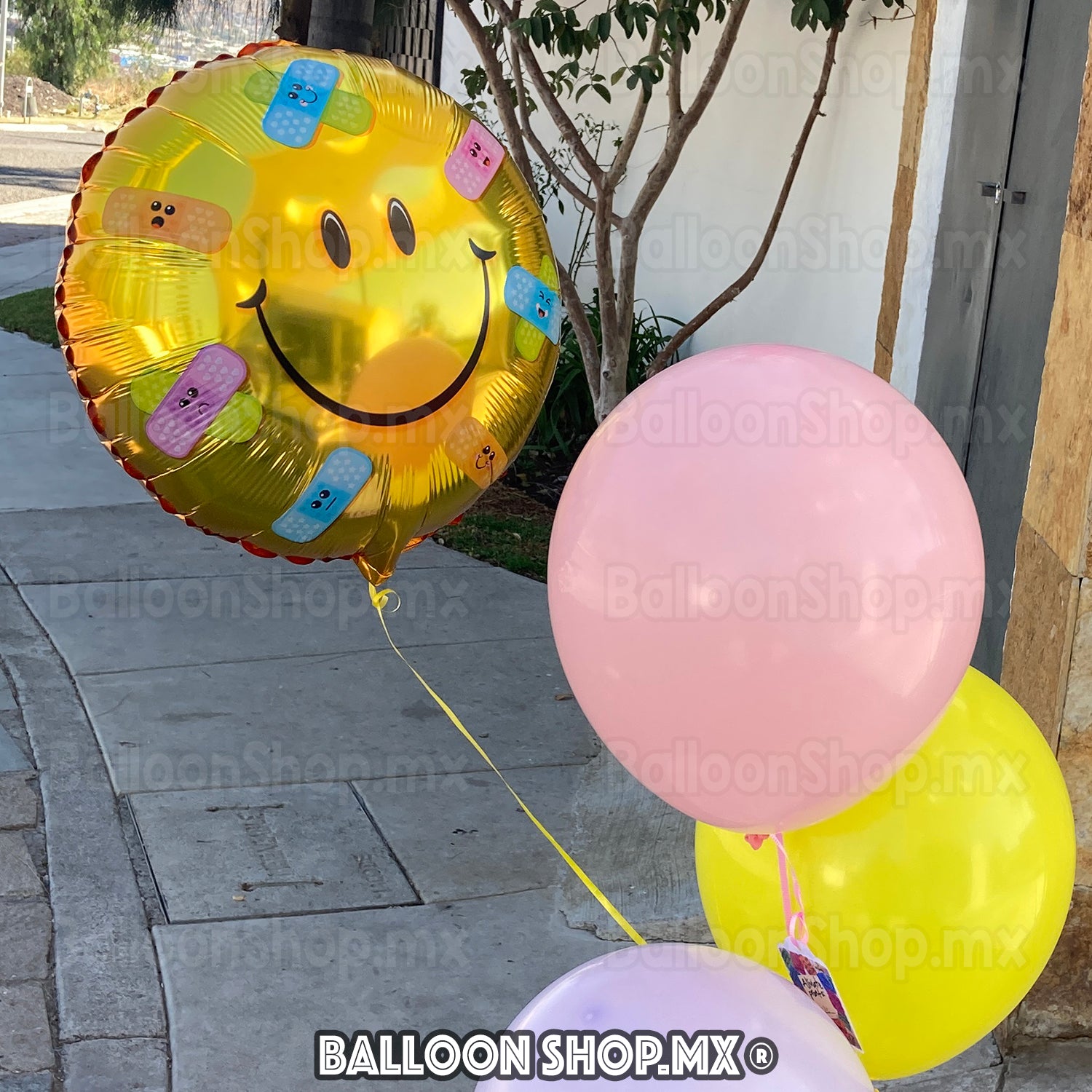 Globo redondo en color amarillo con una carita feliz al centro y decorado con curitas de colores por todos lados. Cada carita trae una carita en medio.