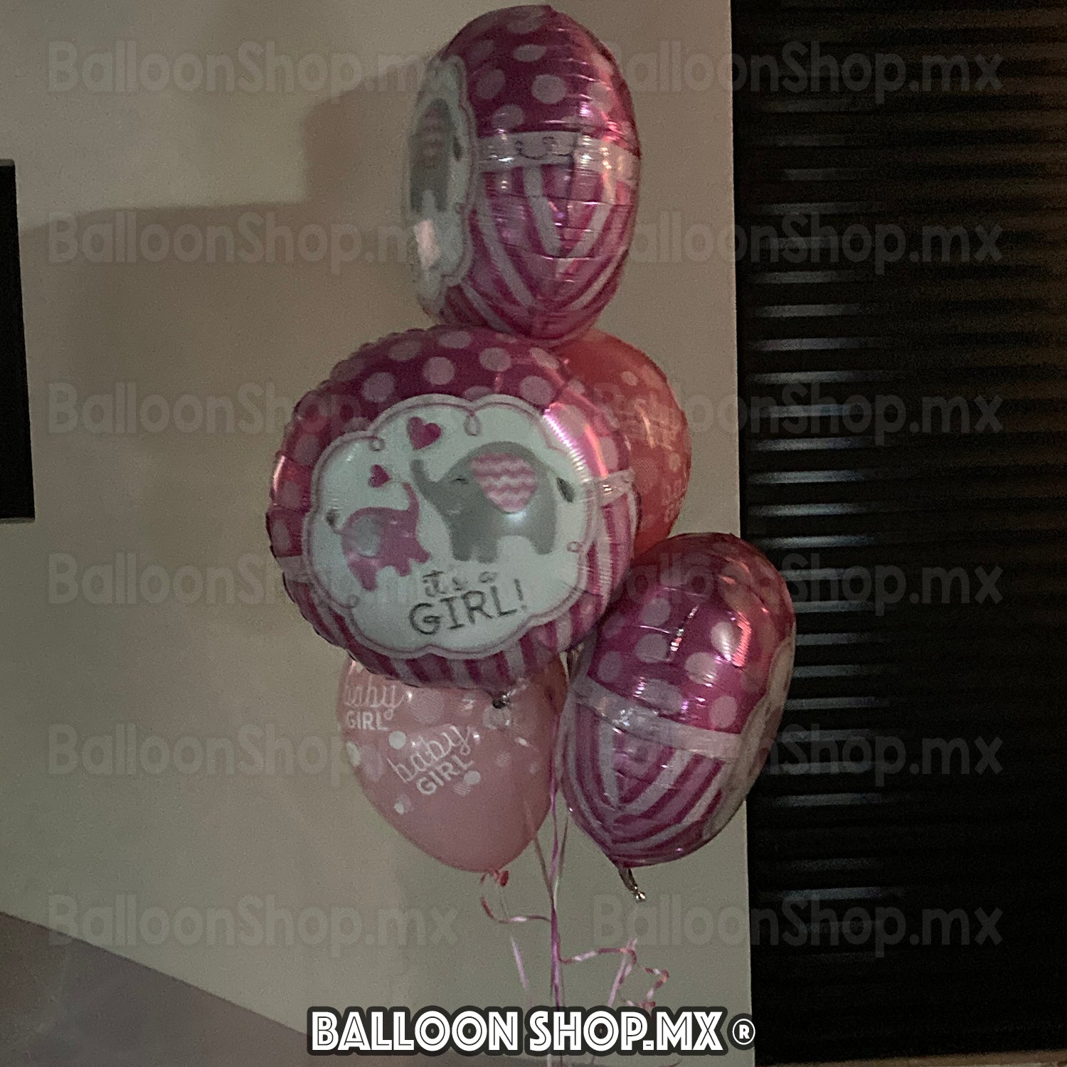 Para complementar el arreglo le recomendaríamos unos globos de látex (3 a 6 piezas) igualmente en tonos rosas con la frase "It's a girl" o en color blanco. También puede combinarlo con otros diseños de globos metálicos. Cualquier duda puede contactar a un asesor.