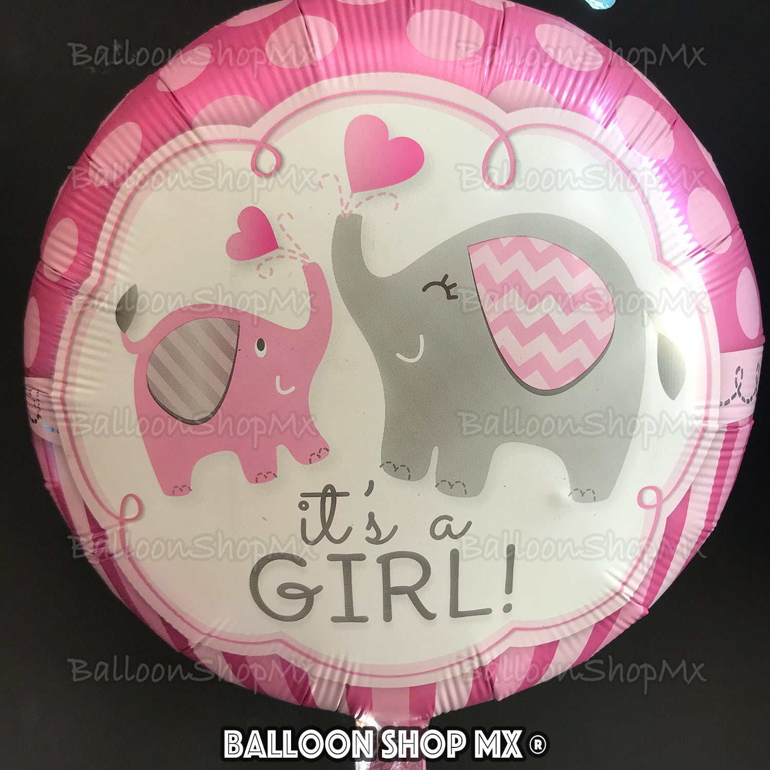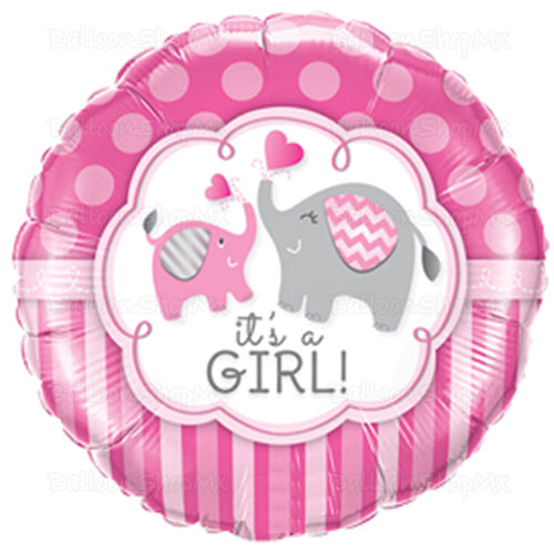 Globo de 18" redondo en colores rosas. En el exterior esta dividido con dos patrones, círculos en la parte superior y rayas en la parte inferior. Al centro en una marquesina blanca dos elefantitas con corazones y la frase "It's a girl".