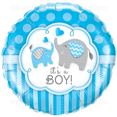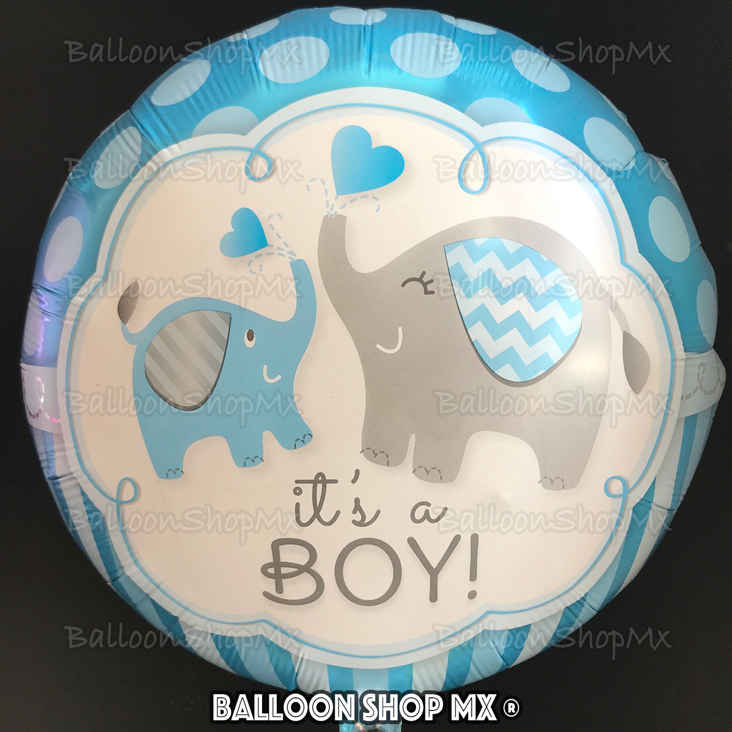 Globo de 18" redondo en colores azules. En el exterior esta dividido con dos patrones, círculos en la parte superior y rayas en la parte inferior. Al centro en una marquesina blanca dos elefantitos con corazones y la frase "It's a boy".