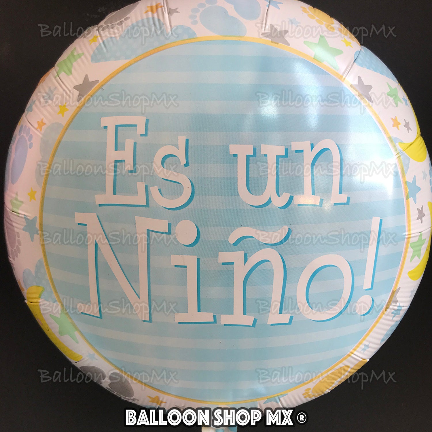Globo redondo en colores pastel. En el exterior esta decorado por huellitas de bebe, nubecitas, lunas y estrellas en un fondo blanco, al centro la frase "Es un niño" con un fondo de rayas azules.