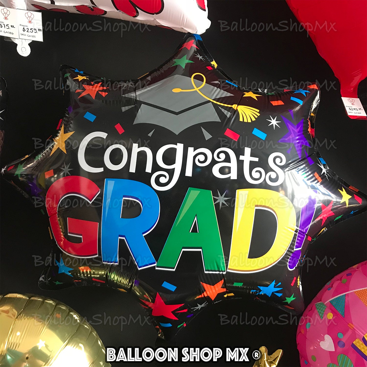 Globo en color negro brillante con la frase "Congrats Grad!" al centro y un birrete en la parte superior. El resto del globo esta decorado con mas estrellas de colores y confeti.