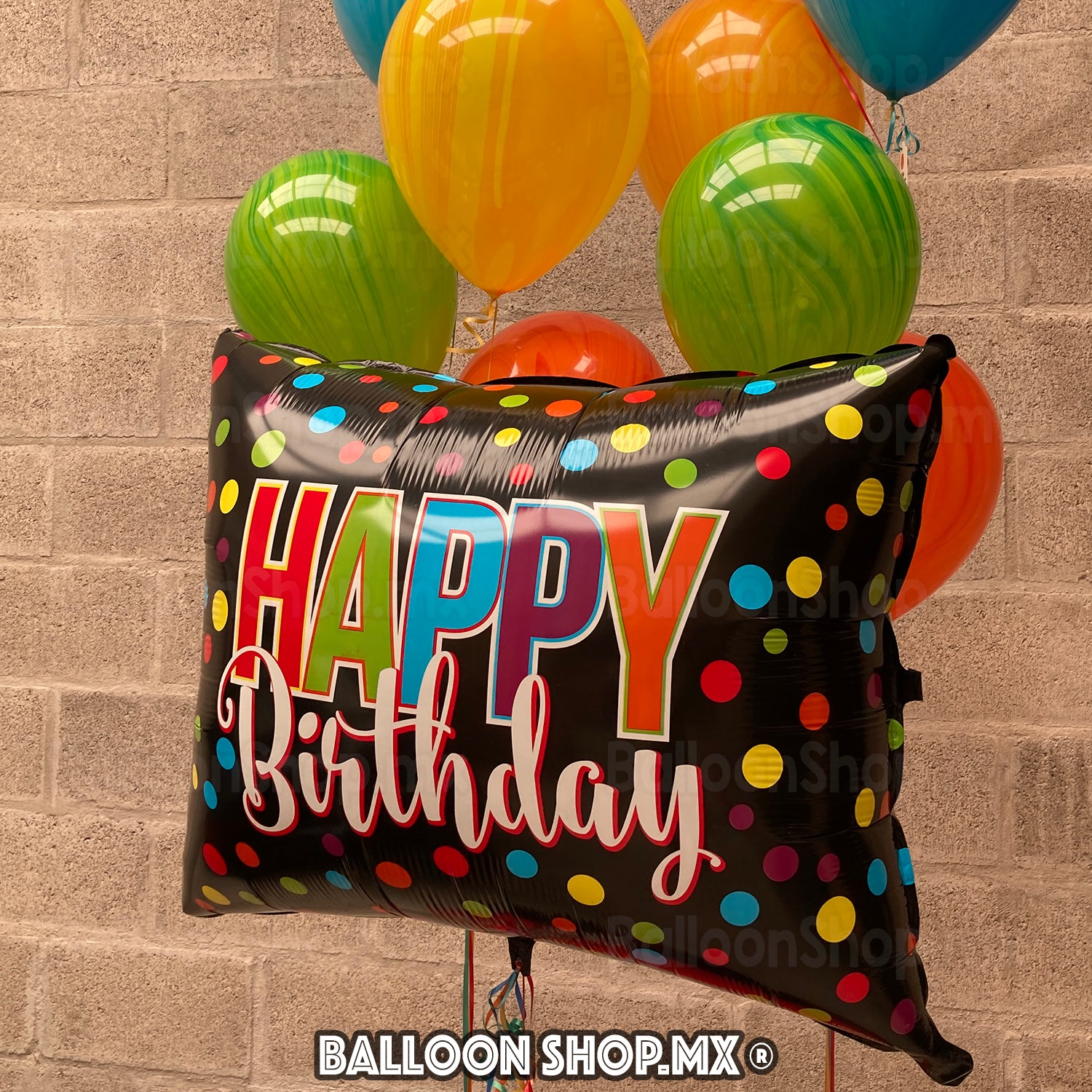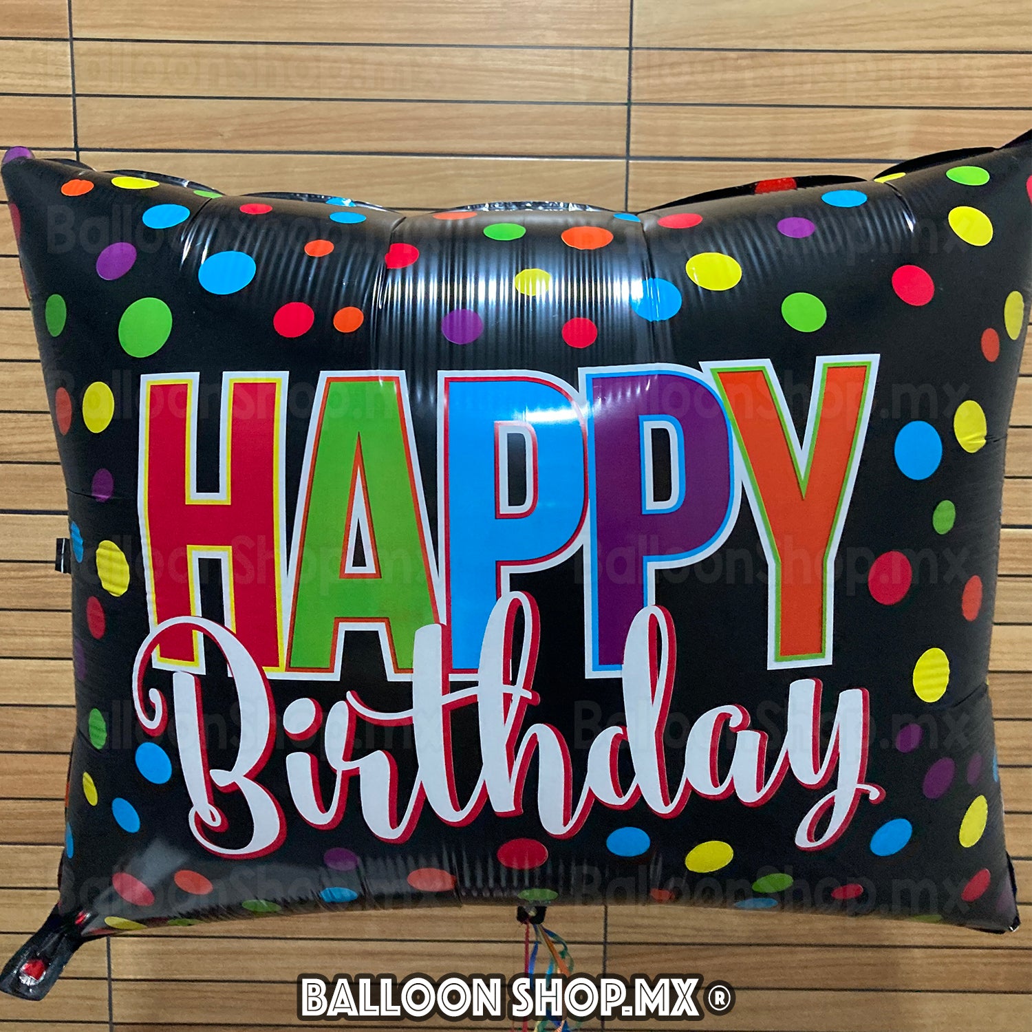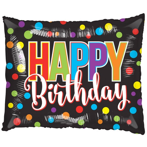 Este globo tiene forma rectangular y un diseño muy llamativo. El color negro mate de fondo hace contraste con círculos de colores vivos que decoran el globo, al centro la frase "Happy Birthday" en letras de colores y con dos estilos de tipografía.