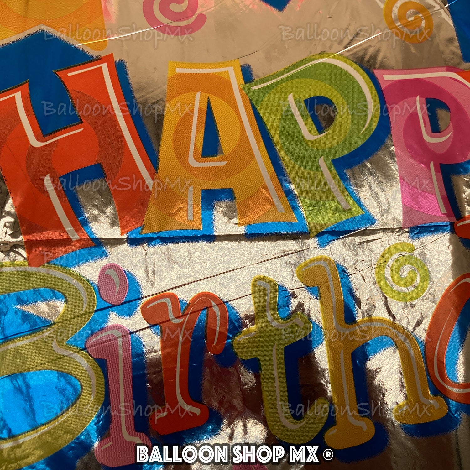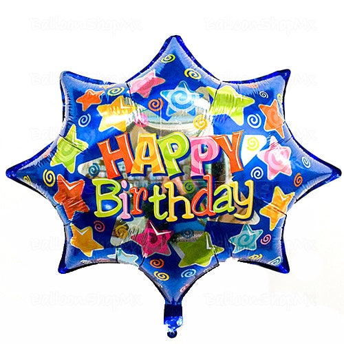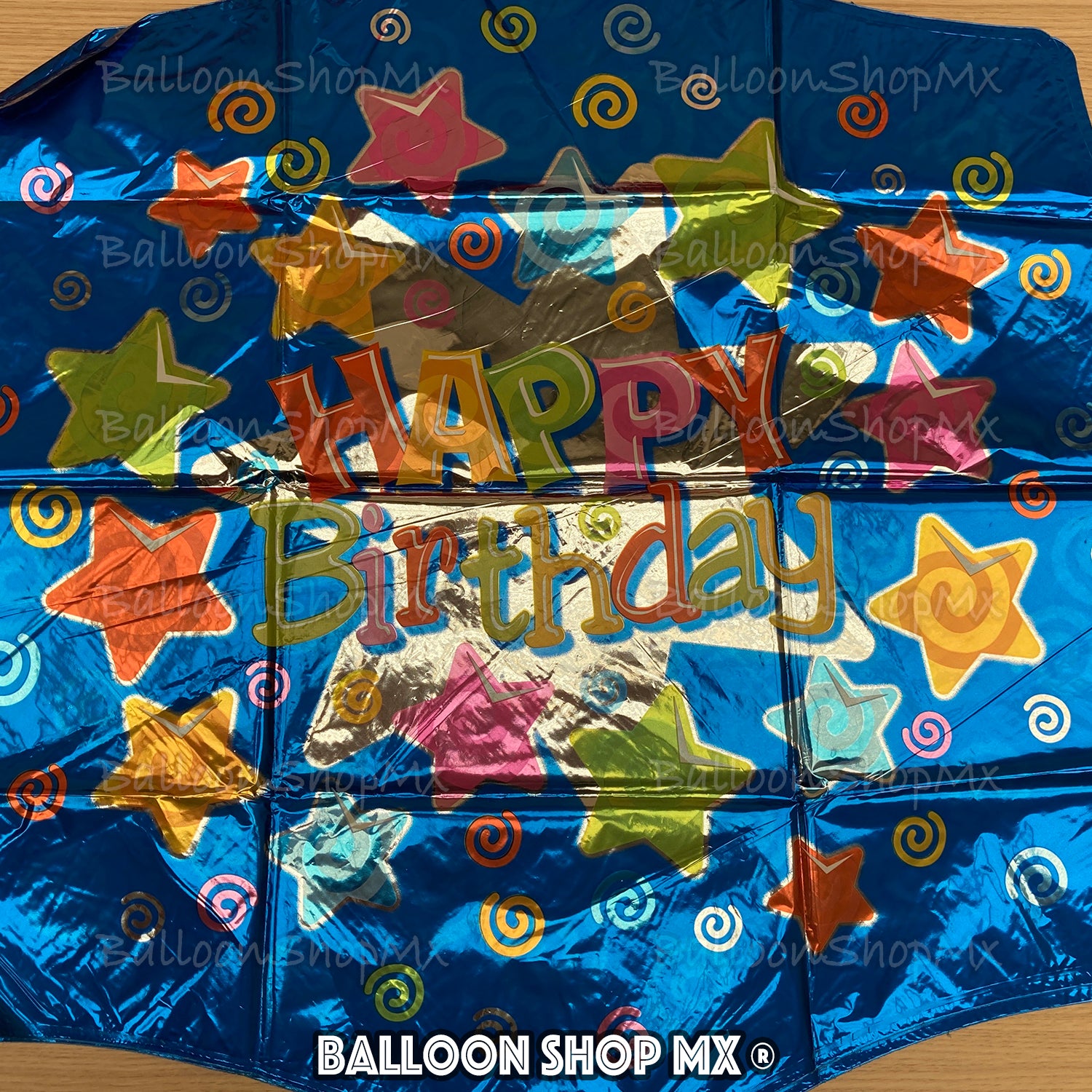Globo en forma de estrella en acabado metálico brillante color azul, al centro tiene la frase "Happy Birthday" en letras de colores también metálicas y trae muchas estrellas también de colores como decoración.