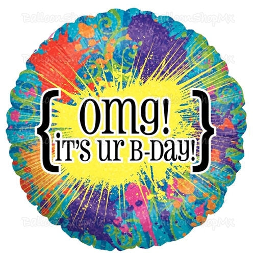 Globo redondo totalmente holográfico en color azul turquesa con un decorado de explosión de colores en varios tonos como rojo, naranja, morado, rosa, verde y al centro amarillo. En corchetes la frase "OMG!, It's ur b-day" en color negro con borde blanco.