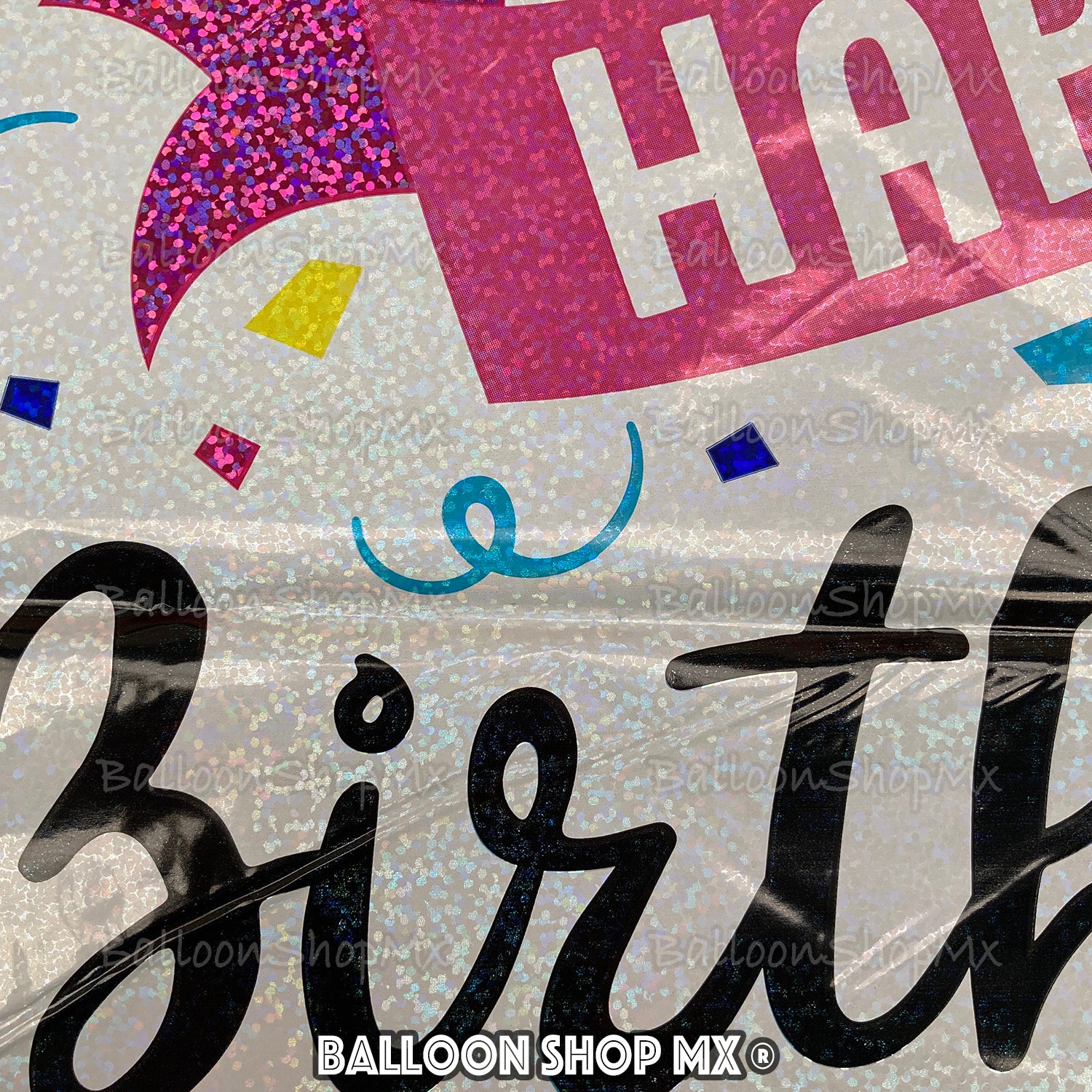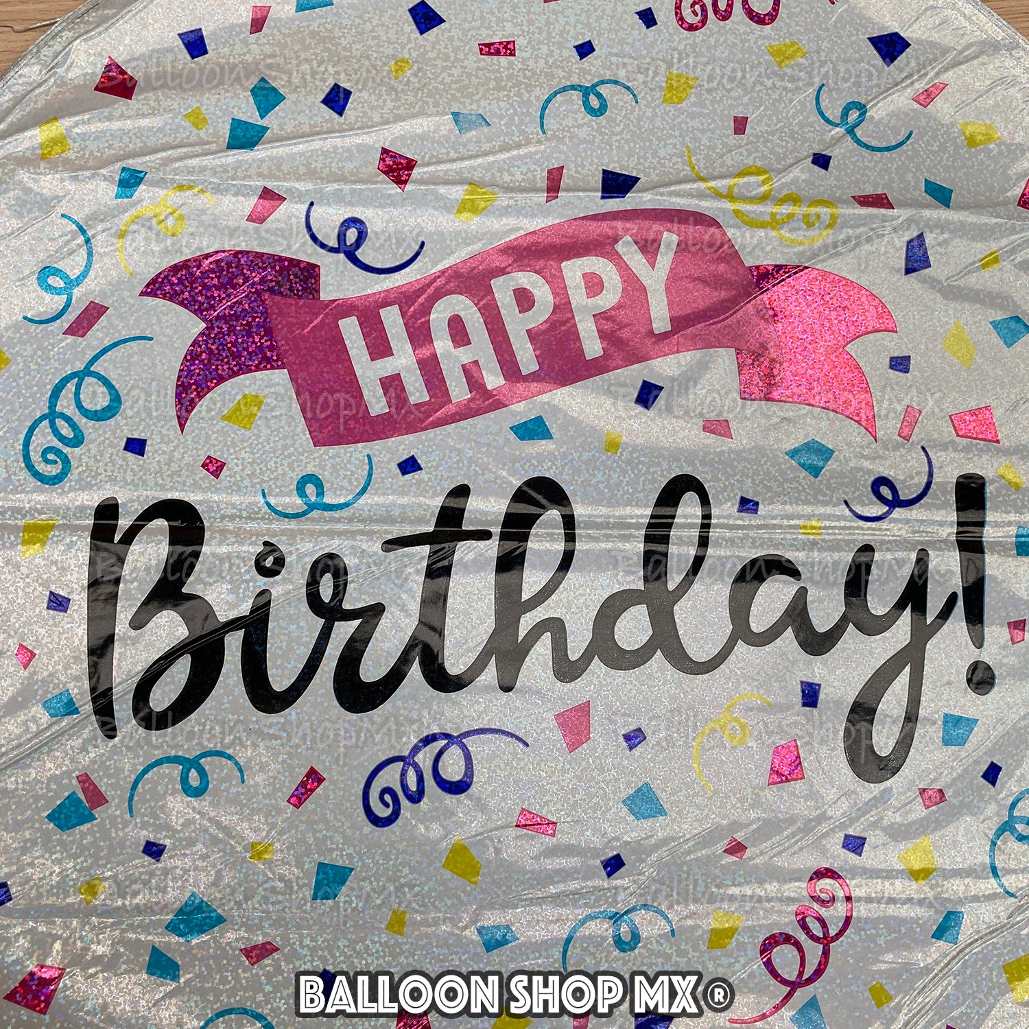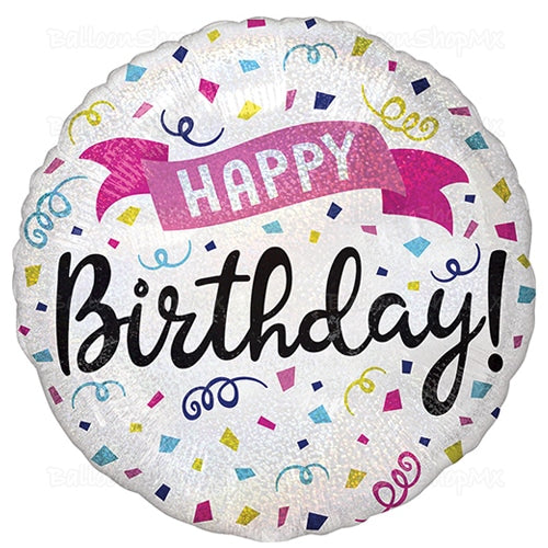 Globo redondo en color blanco con acabado holográfico y la frase "Happy Birthday" al centro. El resto del globo esta decorado con confeti y serpentinas.