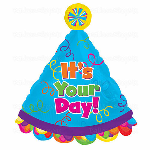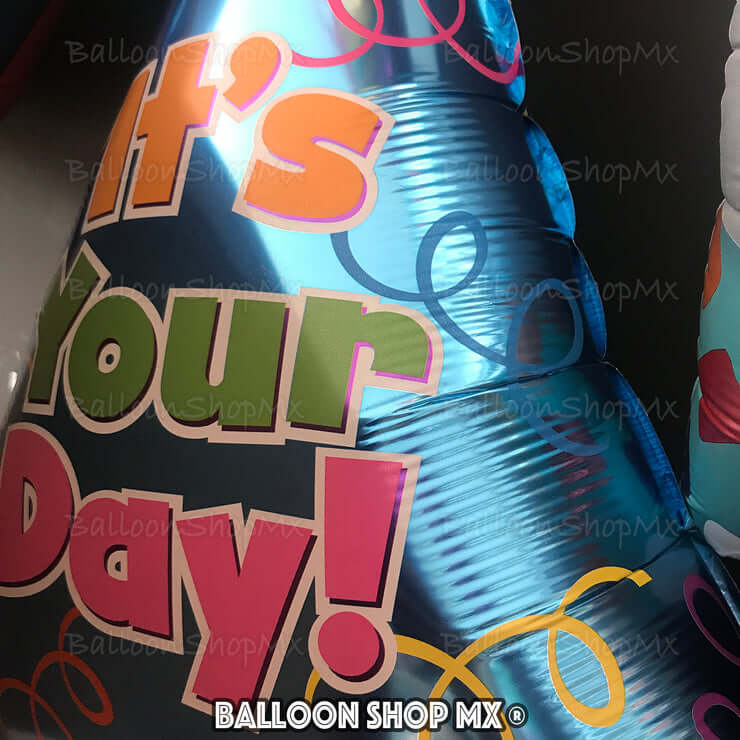 Globo en forma de gorrito de fiesta de color azul metálico, al centro la frase "It's Your Day!", con un un pompón amarillo y azul en la superior y en la inferior unos olanes.