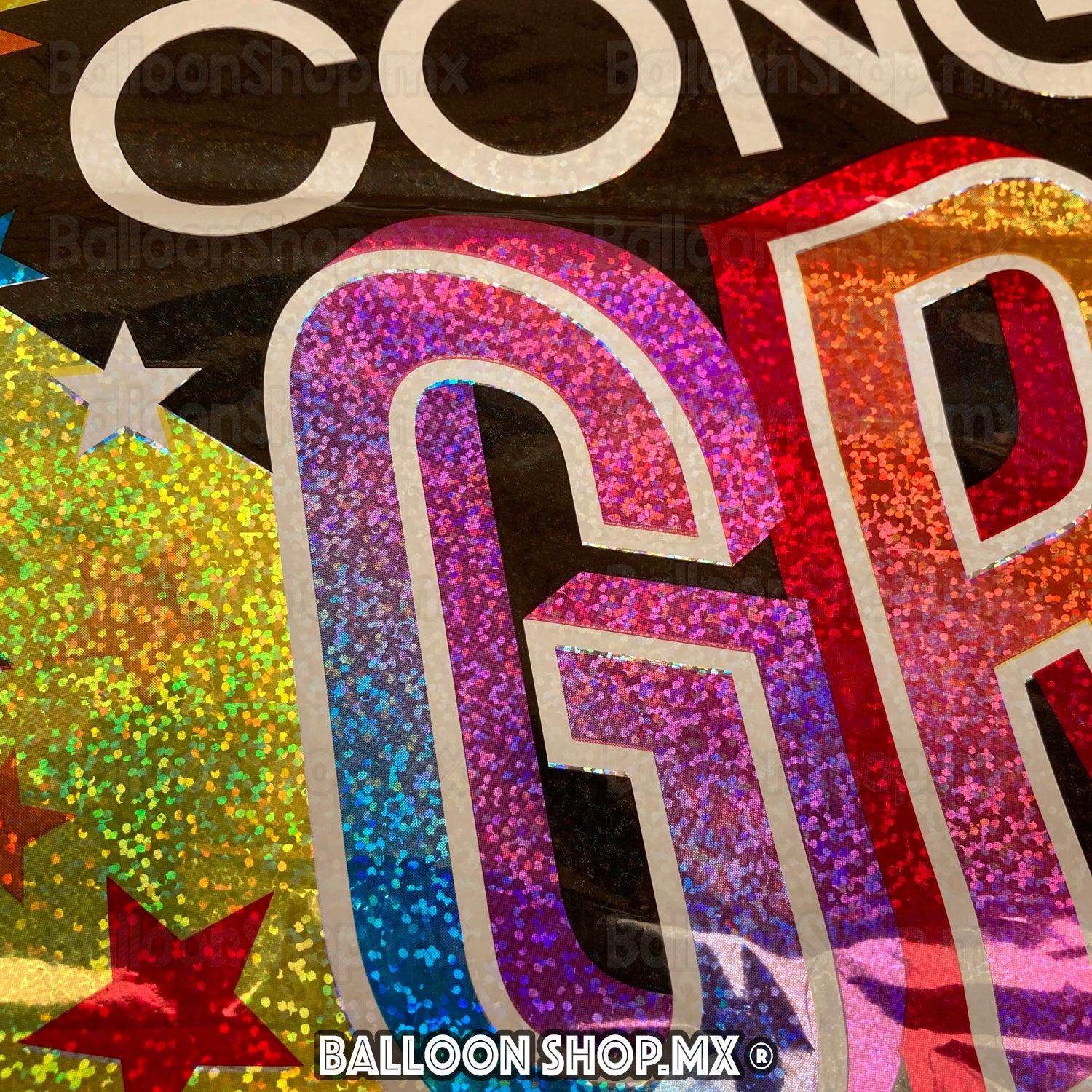 Globo rectangular de 18" en acabado holográfico en paleta degradada. Al centro tiene una estrella de color negro con la frase "Congrats GRAD" y un birrete.