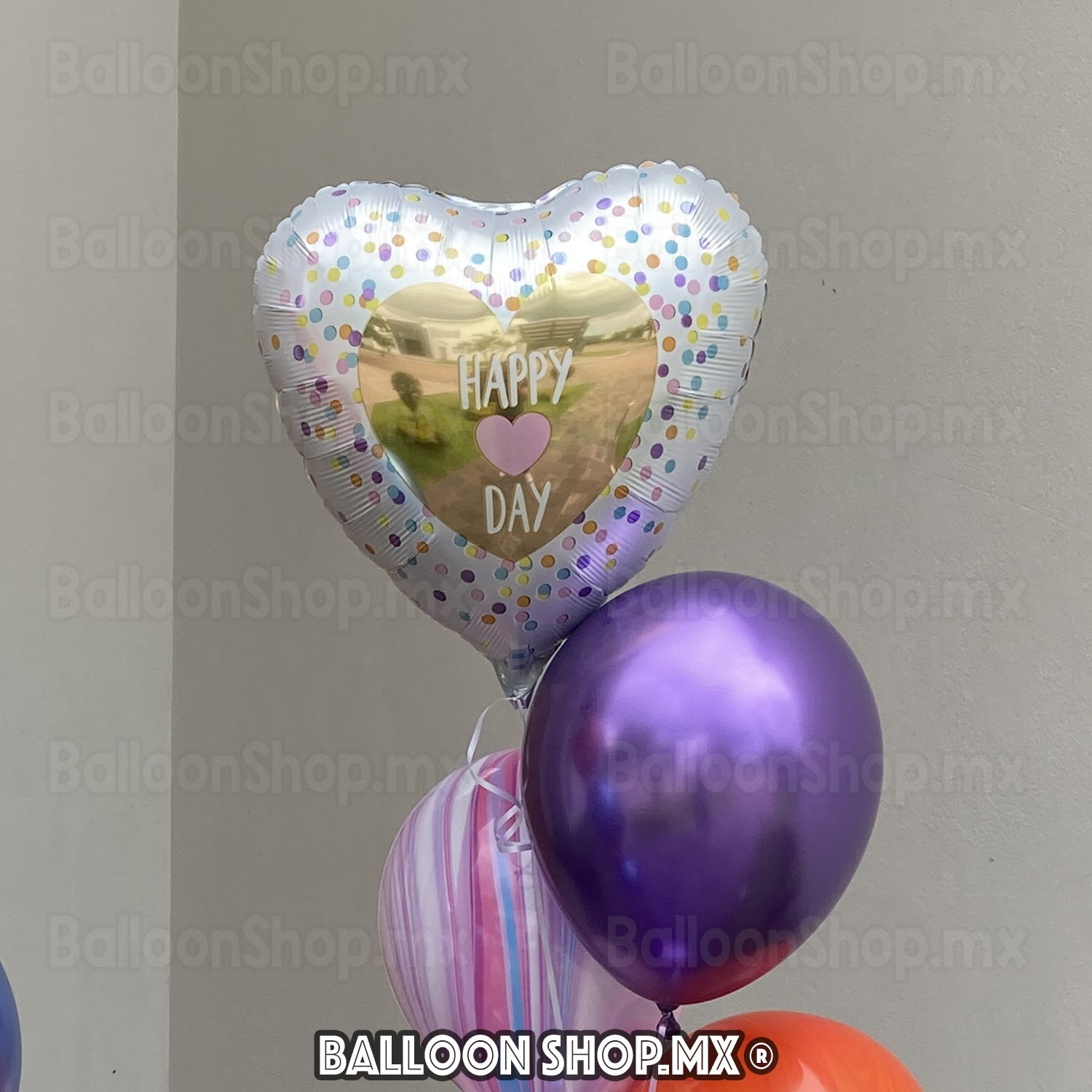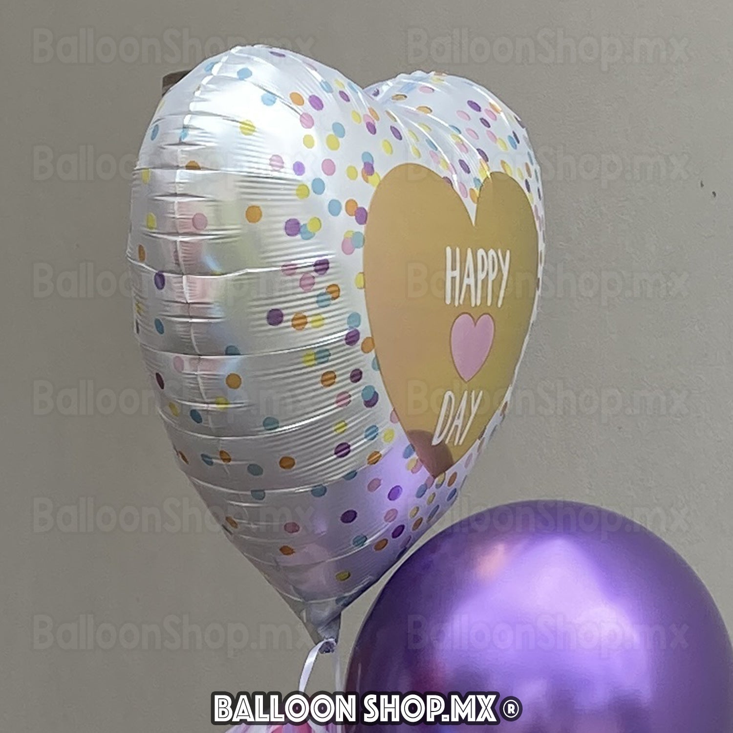 Globo en forma de corazón en color plata satinado, decorado con círculos de diferentes colores en todo el exterior del globo y al centro un corazón más pequeño color dorado satinado con la frase "Happy Day".